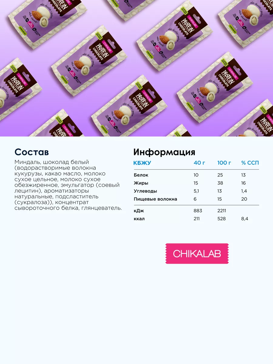 | Состав | миндаль, шоколад белый (водорастворимые волокна кукурузы, какао масло, молоко сухое цельное, молоко сухое обезжиренное, эмульгатор (соевый лецитин), ароматизаторы натуральные, подсластитель (сукралоза)), концентрат сывороточного белка, глянцеватель |