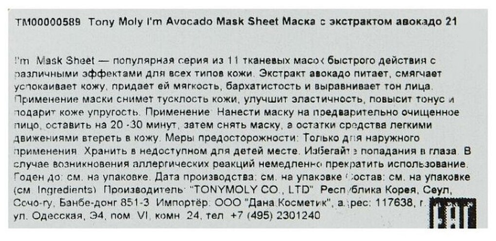 На сегодняшний день товар «TONYMOLY Питательная тканевая маска для лица с экстрактом авокадо I'm AVOCADO Mask Sheet Nutrition 21г (397228)» можно купить с кешбеком в 1 магазине: Яндекс.Маркет