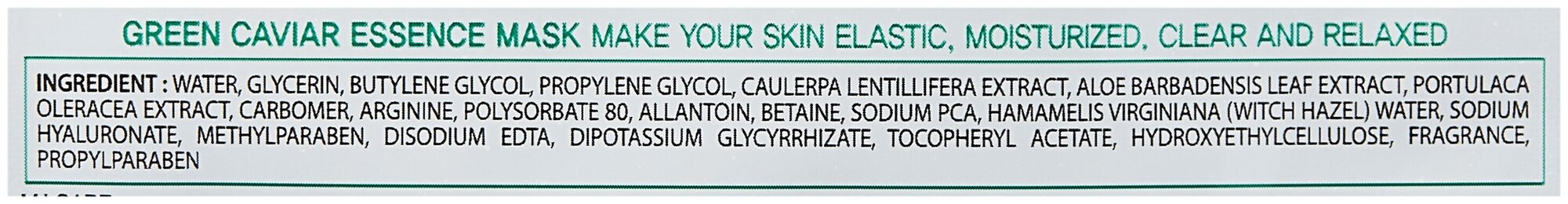 Маска для лица с экстрактом зелёной икры повышает эластичность и улучшает тургор кожи, делает контуры лица более чёткими. В состав маски также входят экстракты алоэ, портулака огородного и гамамелиса, аргинин, аллантоин, бетаин, гиалуроновая кислота.
