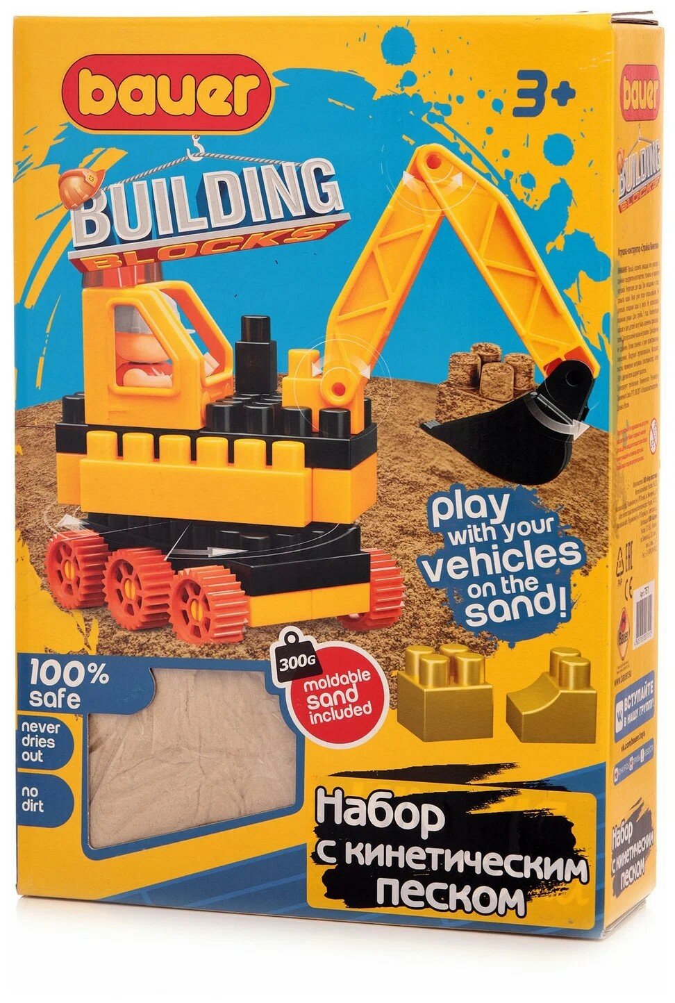 Конструктор Bauer является классическим блочным конструктором с крупными деталями. Элементы сделаны из высококачественного пластика с использованием пищевых красителей. Конструкторы «Стройка Кинетик» позволяют не только собрать строительную технику из кубиков, но и придумать собственные постройки из входящего в набор кинетического песка. С наборами серии можно создать самую настоящую строительную площадку у себя дома