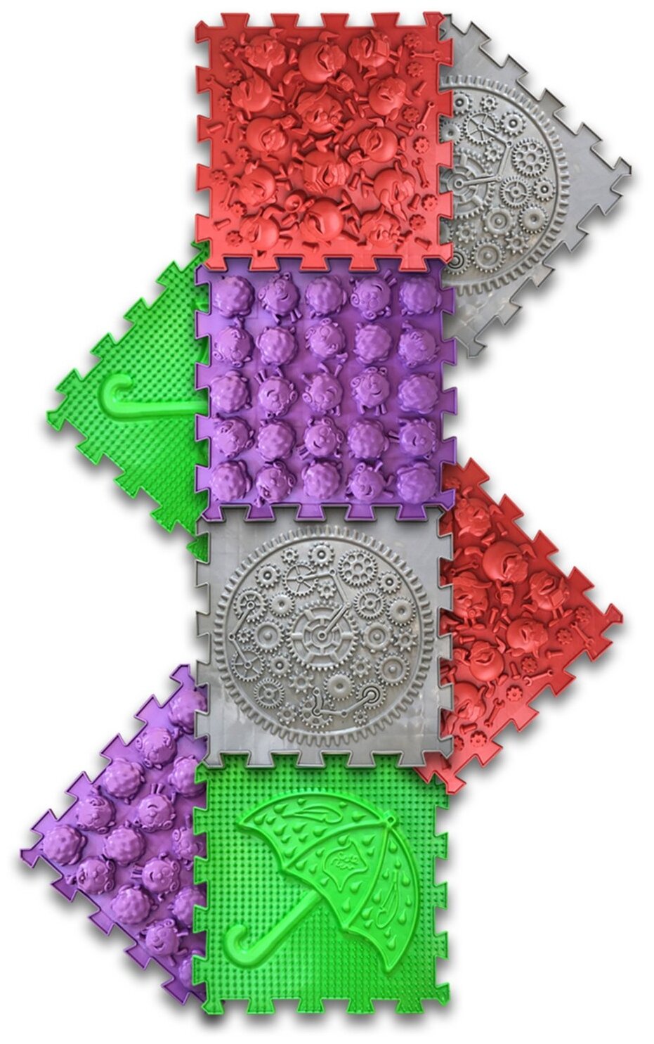 Массажные коврики представляют собой отдельные модули, которые соединяются по принципу «пазл» за счёт усовершенствованного авторского замка-крепления. Благодаря различной фактуре и жёсткости поверхности во время занятий стимулируются необходимые рецепторы стопы ребёнка, способствуя формированию её физиологических сводов. Коврик заметно улучшает функции стопы, способствует развитию и укреплению мышечно-связочного аппарата, предотвращает деформацию стоп, а также уменьшает нагрузку на суставы. Тормозной шип предотвращает скольжение по гладким поверхностям. При производстве коврика использованы нейтральные и гипоаллергенные красители. Назначение: профилактика плоскостопия у детей, массаж стоп, снятие усталости мышц. Показания: статическая недостаточность мышечно-связочного аппарата стопы у детей: плоскостопие, плоско-вальгусная деформация стопы, а также профилактика этих состояний. Противопоказания: механические повреждения кожного покрова на подошве стопы, синдром диабетической стопы, нестабильность голеностопного сустава. При грибковых поражениях стопы используйте коврик строго индивидуально.