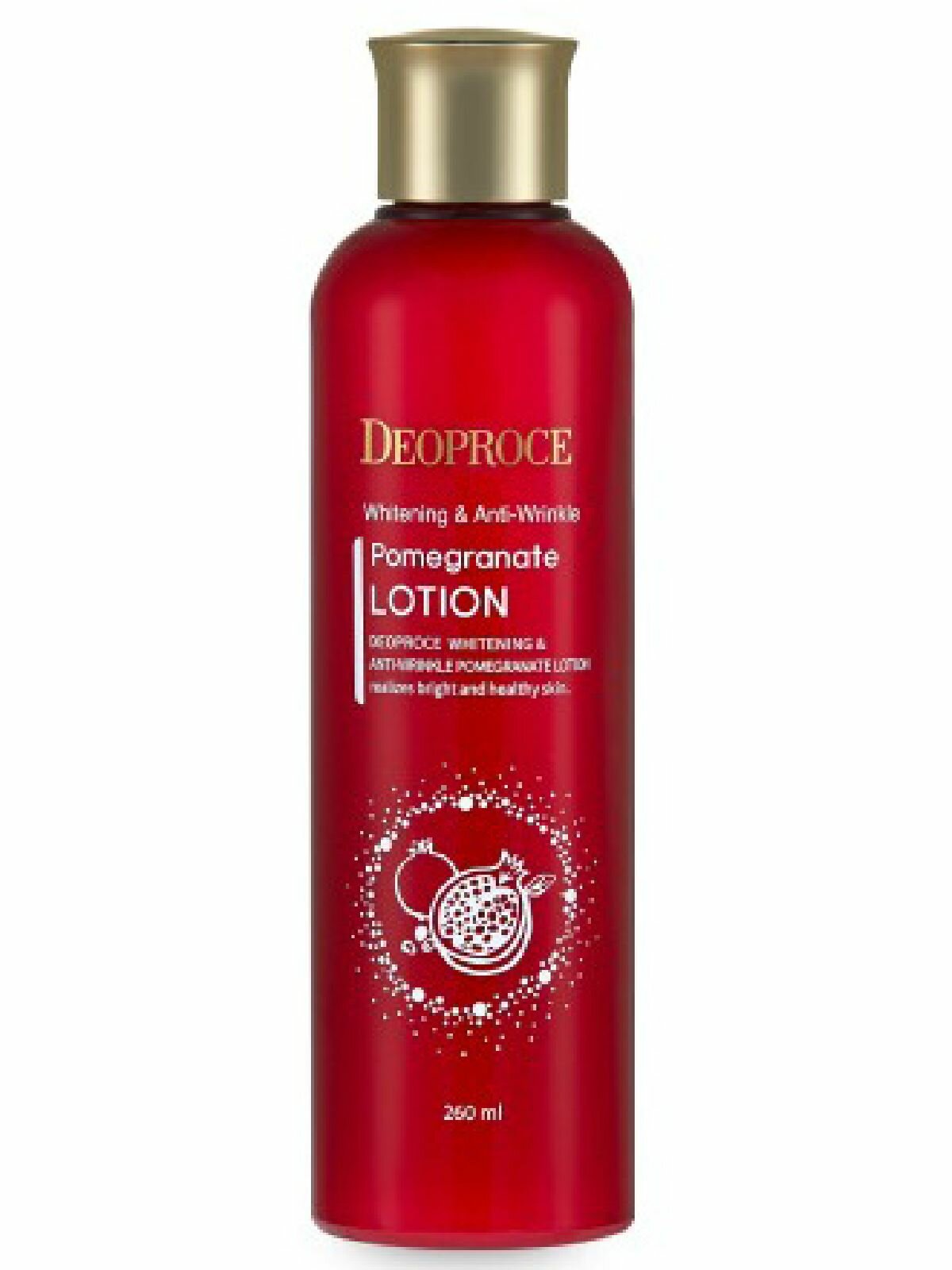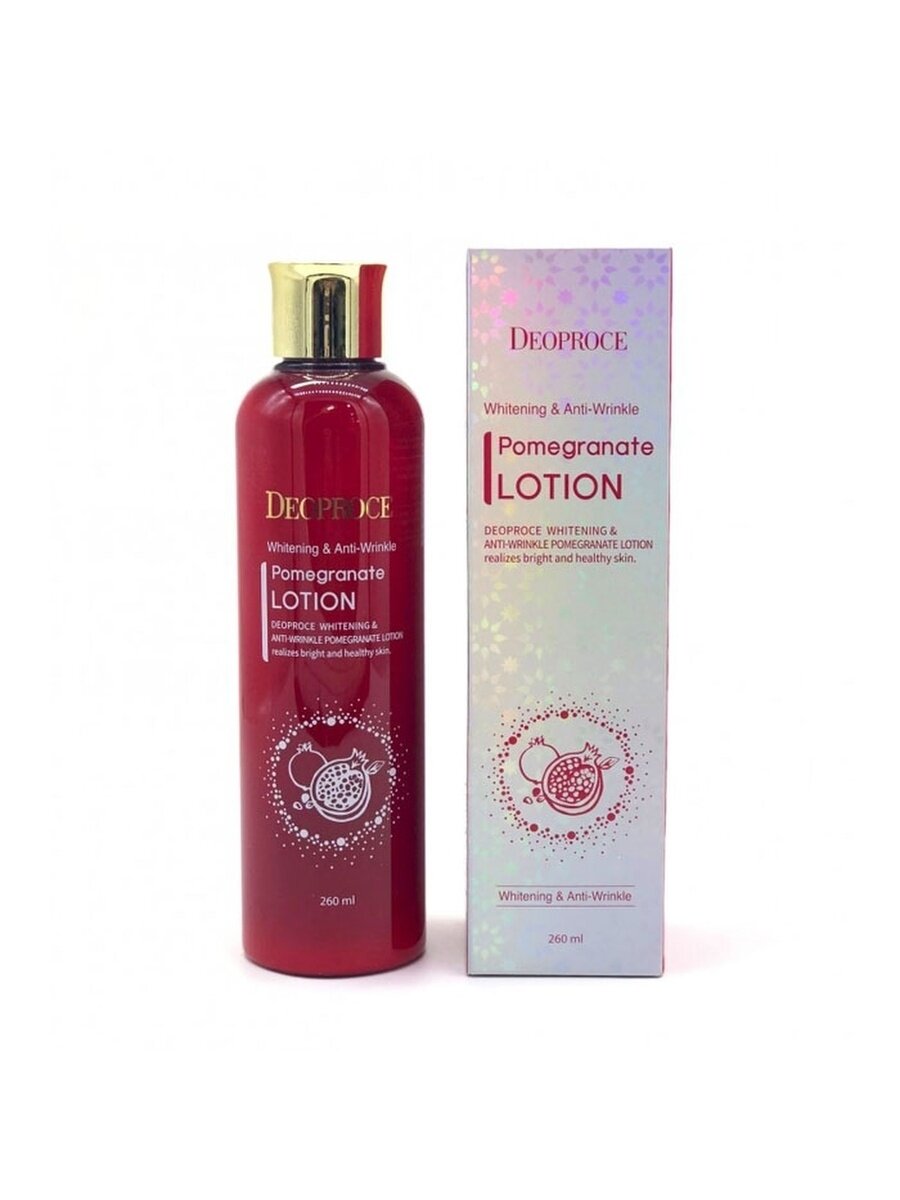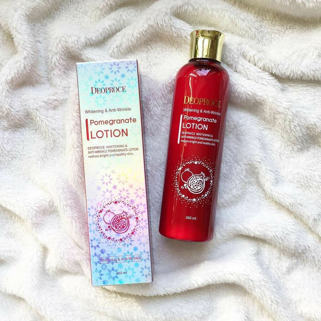 Линия средств Whitening & Anti-Wrinkle Pomegranate от Deoproce, созданных на основе экстракта граната, предназначена для эффективного омолаживания кожи. Средства двойного действия, направлены на осветление пигментации и разглаживание морщин. Лосьон с экстрактом граната с легкой и освежающей текстурой является эффективным антивозрастным и антиоксидантным средством. Лосьон питает и увлажняет кожу, освежает ее и тонизирует. Благодаря экстракту граната, ускоряется выработка коллагена, кожа восстанавливается и обновляется, постепенно становится более упругой и эластичной, морщины разглаживаются, замедляются процессы старения. Экстракт граната является источником природных фруктовых кислот, которые бережно отшелушивают омертвевшие клетки кожи, удаляют меланин, что приводит к осветлению существующей пигментации и предупреждает появление новой – лицо обретает свежесть и ухоженность.