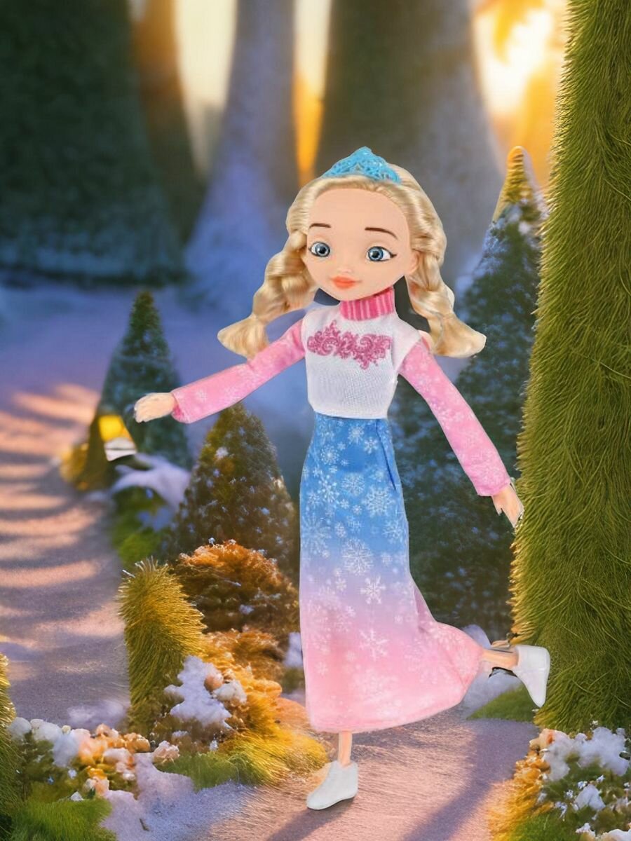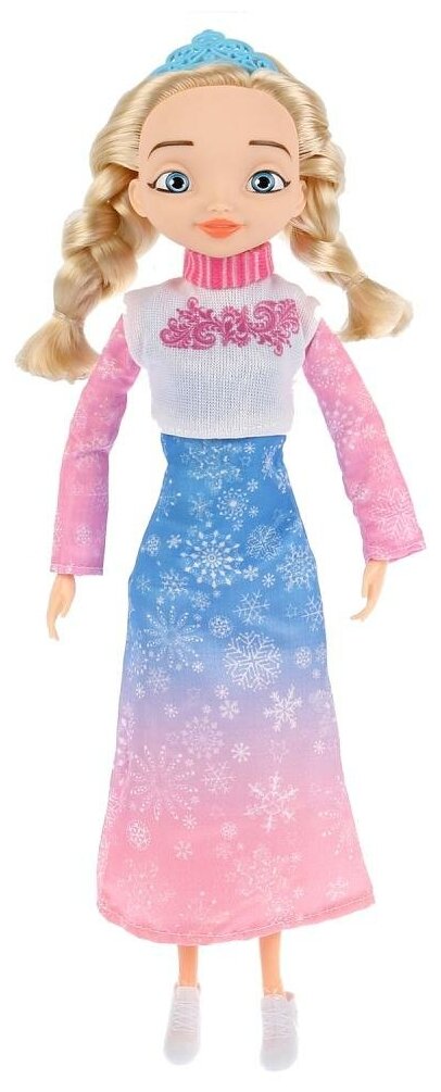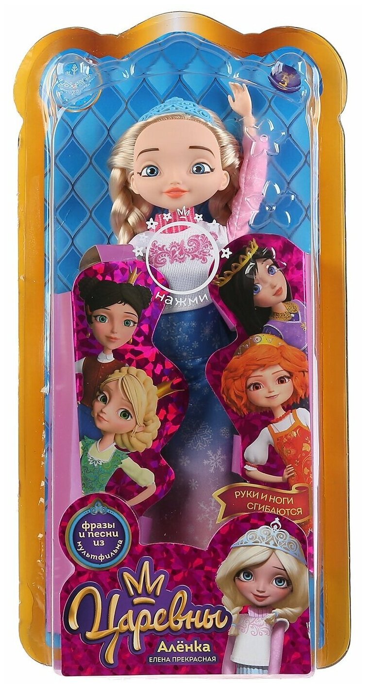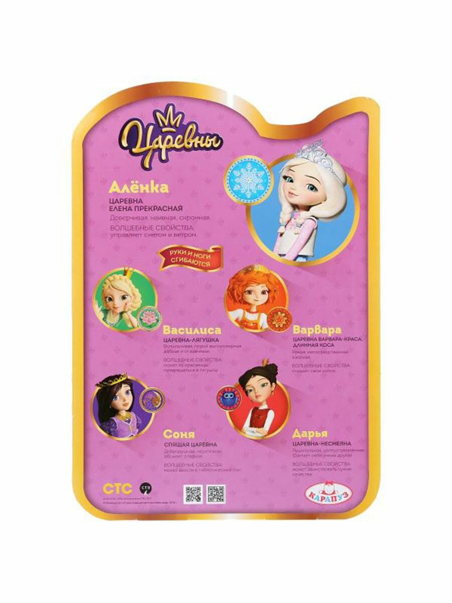Алёнка одета в стильное платье и туфельки, в точности как героиня из мультфильма «Царевны». Образ царевны дополняет корона и серёжки. Одежду и аксессуары легко снять и надеть. Лицо куклы детально проработано. Длинные шелковистые волосы легко расчёсывать и создавать разнообразные причёски.