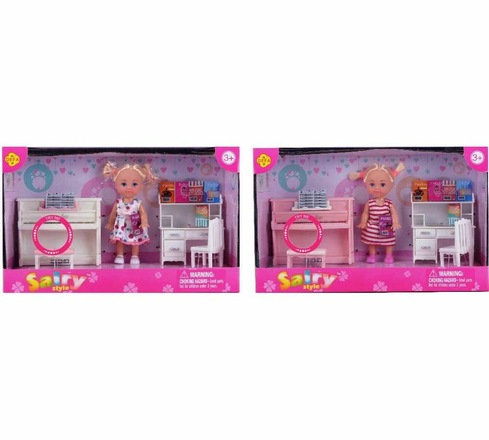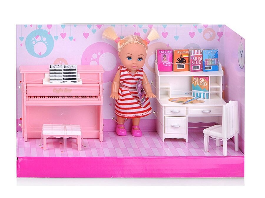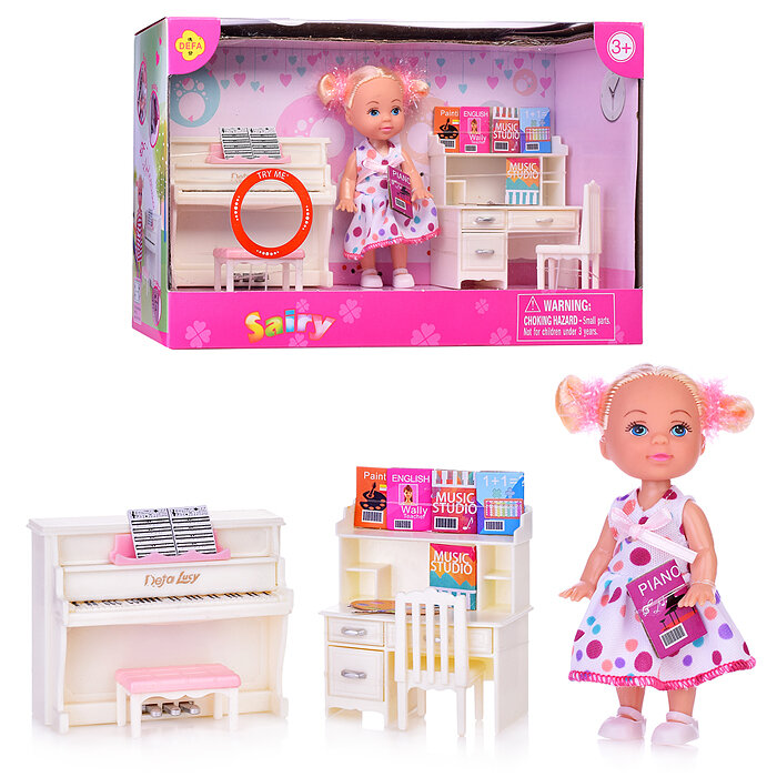 | Комплектация | кукла в одежде, пианино с нотами, табурет, письменный стол с книгами, стульчик. |