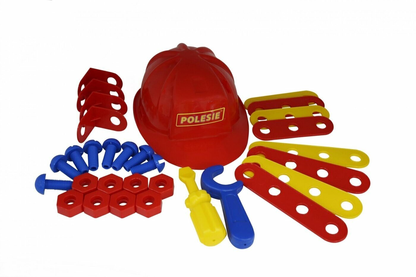 Набор для мальчиков, состоящий из отвертки, гаечного ключа, а также соединительных пластин, уголков, винтов, гаек и самого главного атрибута слесаря каски. Набор отлично подойдет для первого знакомства мальчика со слесарным инструментом, его назначением, принципами работы.