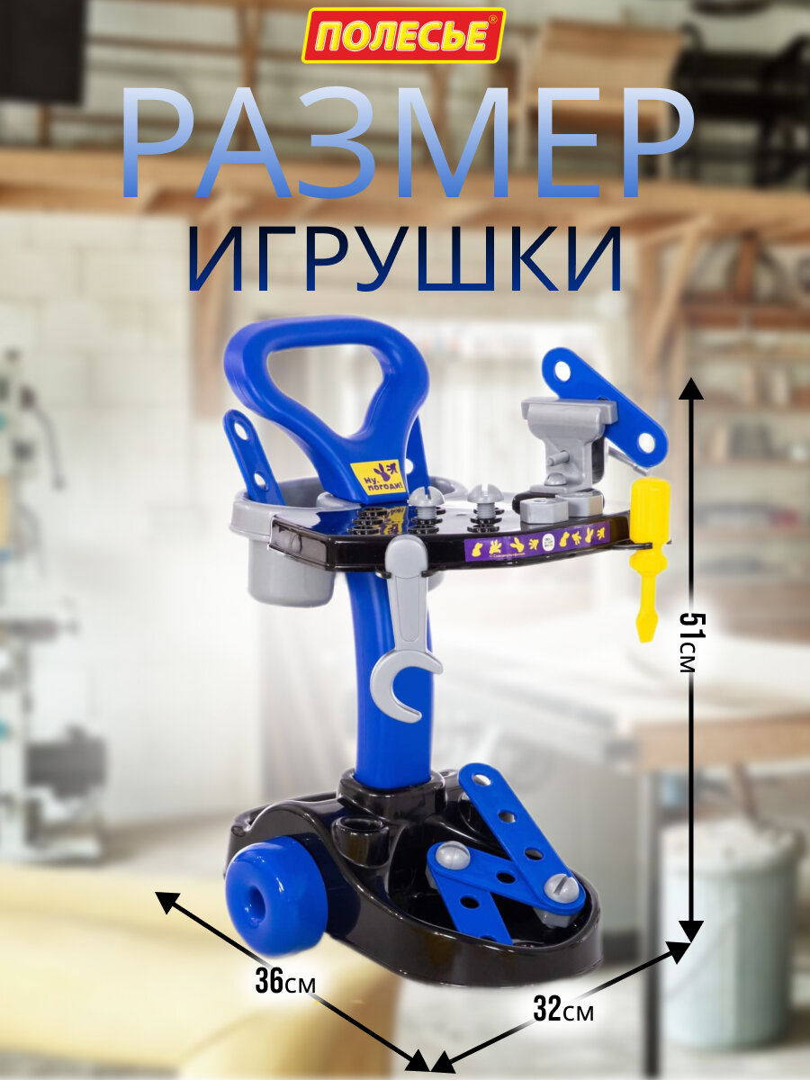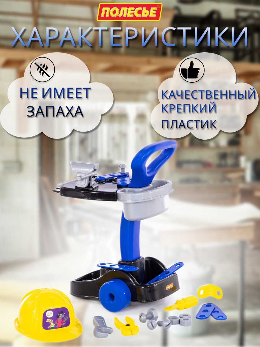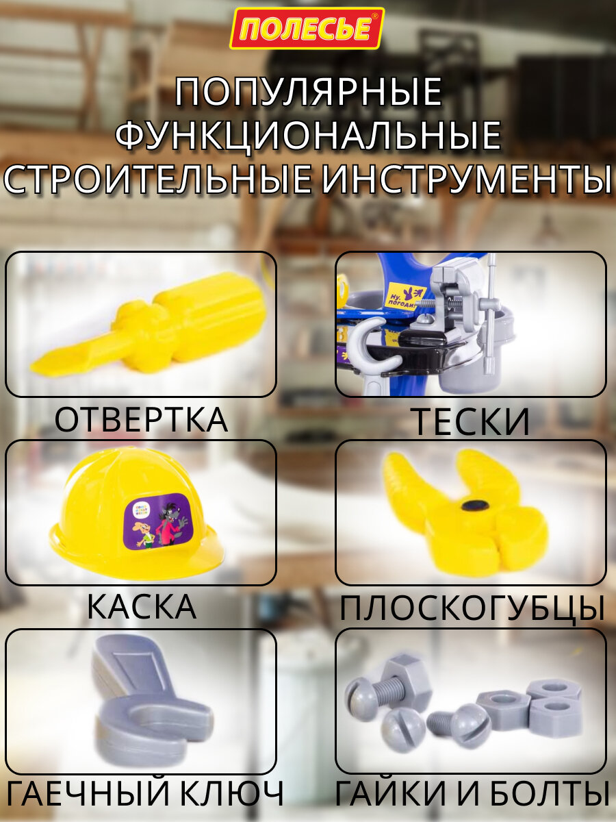 Фабрика «Полесье» и киностудия «Союзмультфильм» представляют набор «Механик «Ну, погоди!». Комплект научит мальчиков пользоваться мини-копиями оригинальных инструментов, фантазировать, соединять детали между собой. Набор знакомит малышей с профессией техника-механика, способствует развитию творческого потенциала, моторики рук, координации движений. Все принадлежности компактно расположены на передвижной тележке, что позволяет удобно перемещать и хранить набор. Вверху тележки предусмотрена платформа для инструментов, на ней же установлены игрушечные тиски. Внизу конструкции имеются вместительные ниши для строительного инвентаря.