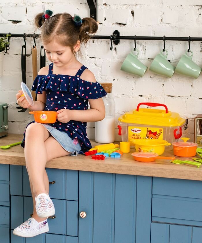 Набор посуды для кукол «Три кота» выполнен в цветовой гамме, которая подымает настроение! Элементы набора украшены наклейками с изображением персонажей мультфильма «Три кота», поэтому играть детской посудой приятно и интересно. Умение готовить и заботиться о чистоте помогут девочке в будущем. Можно устроить чаепитие и научиться сервировать стол. Комплект позволит ребёнку познакомиться с профессией кондитера, так как в наборе много элементов для выпечки. Игра с детской посудой развивает воображение, мелкую моторику рук, память.