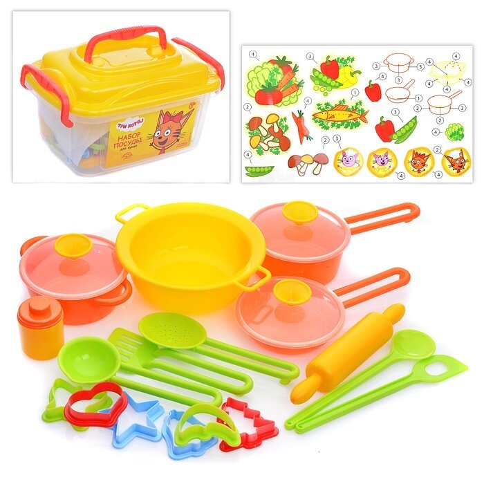 | Комплектация | контейнер, кастрюля с крышечкой — 1 шт., кастрюлька с ручкой и крышечкой — 1 шт., сковорода с крышечкой — 1 шт., миска глубокая с ручками — 1 шт., скалка — 1 шт., формочки — 6 шт., баночка с крышечкой — 1 шт., нож для теста — 1 шт., ложка — 1 шт., черпак — 1 шт., лопатка — 1 шт., шумовка — 1 шт. |