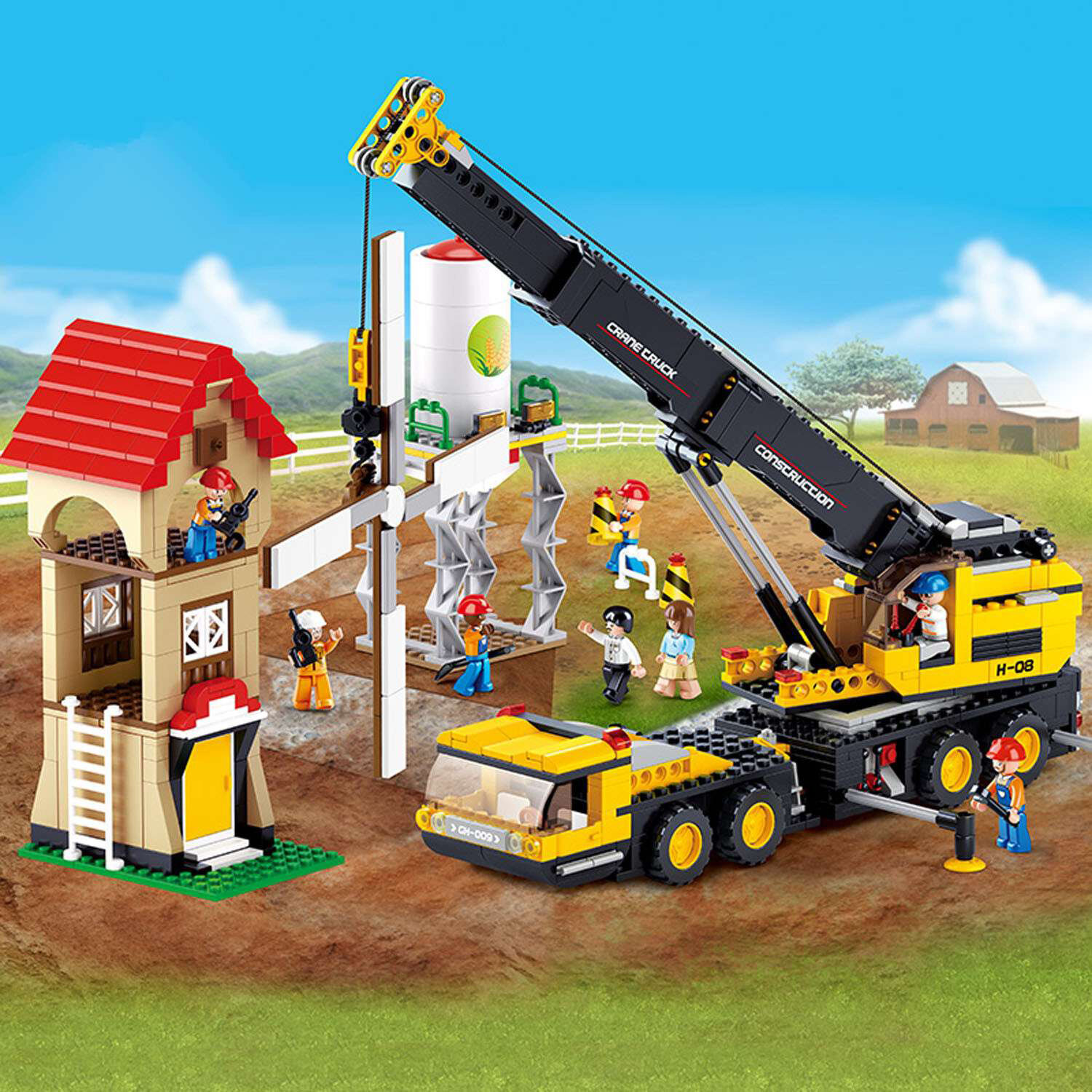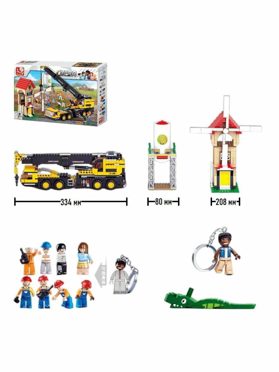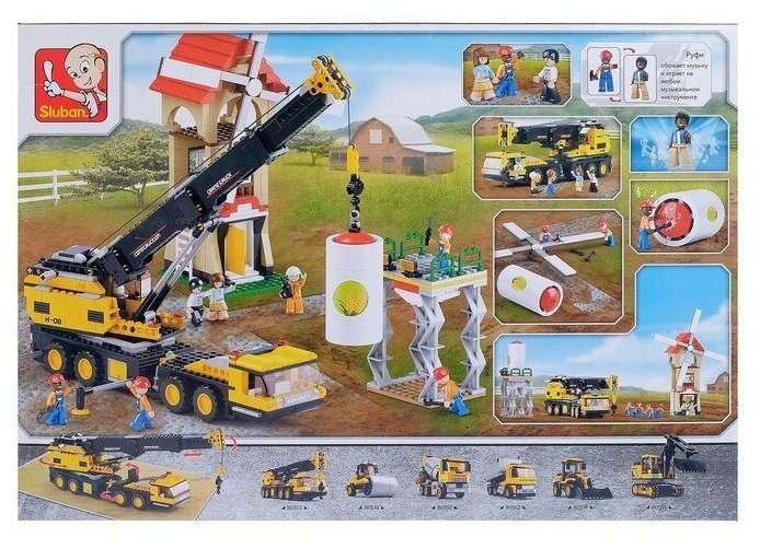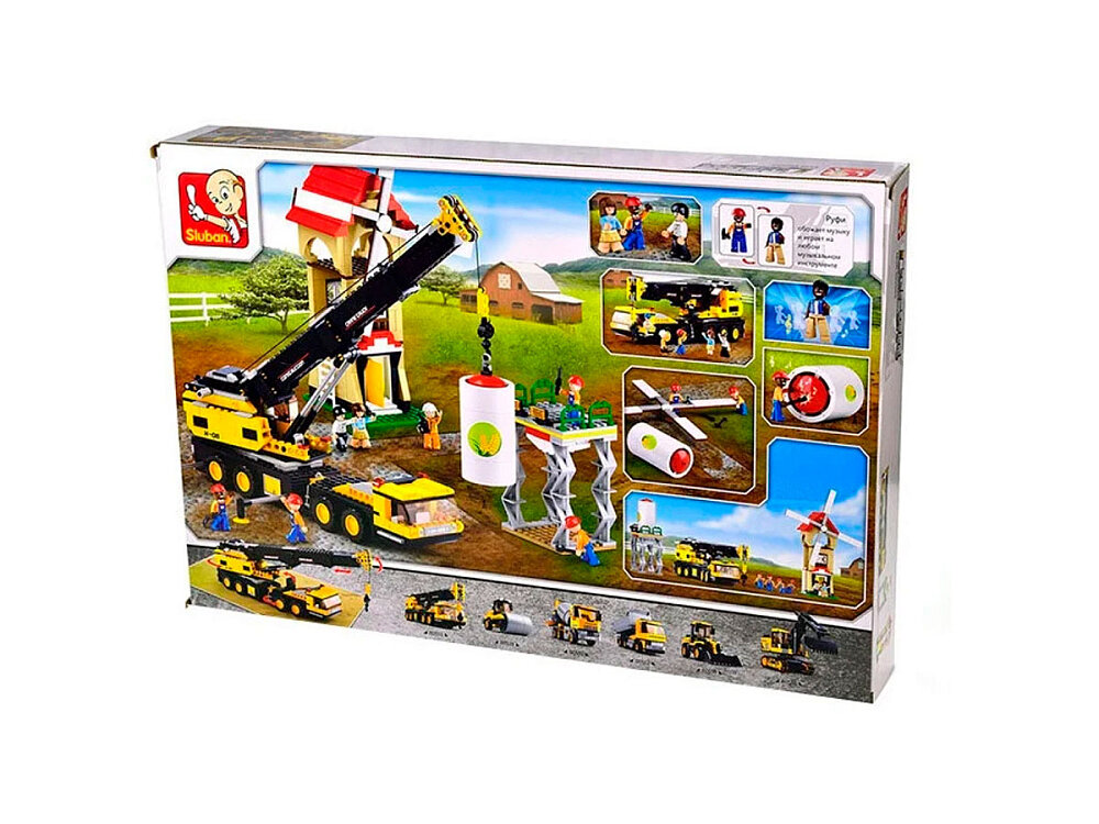 Конструктор Город от всемирно известного бренда Sluban состоит огромного количества деталей и позволяет собрать телескопический подъемный кран и множество других конструкций. После сборки конструктора перед ребенком развернется картина настоящей стройки здания мельницы. Кран поднимает в воздух мельничный винт, а рабочие контролируют процесс. Каждый из игрушечных человечков имеет свою профессию - здесь есть и прораб, и бурильщик, и водитель подъемного крана. Каждый из них одет в спецкостюм и имеет каску на голове.