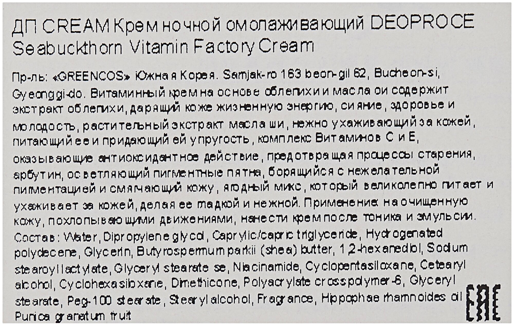 На сегодняшний день товар «Крем ночной омолаживающий Deoproce Seabuckthorn Vitamin Factory Cream 100гр (ДП1972)» можно купить с кешбеком в 1 магазине: Яндекс.Маркет