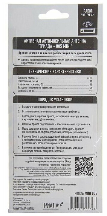 Предназначена для приема радиоволн УКВ, FM, AM в условиях города. Основное преимущество – компактная конструкция и небольшая цена. Хорошо работает на небольших расстояниях от города. От антенн Триада-001 Mini и Триада-003 Mini отличается дизайном, технические характеристики такие же. Рекомендуется потребителям, эксплуатирующим автомобиль в основном в пределах города, которые не хотят переплачивать.