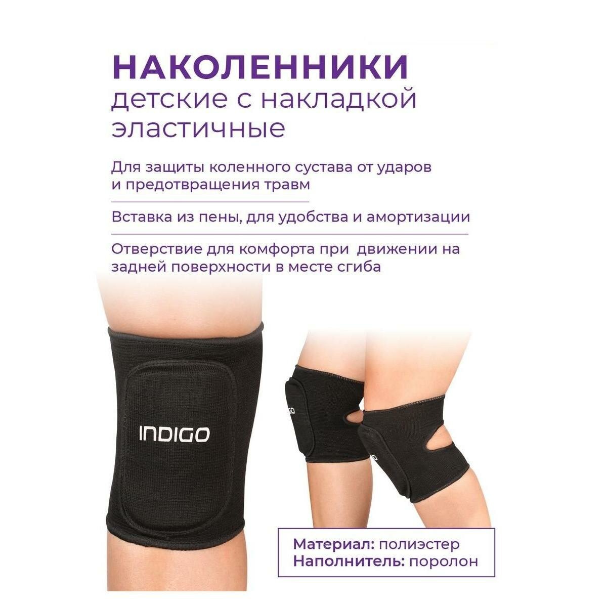 Наколенники INDIGO предназначены для защиты коленного сустава от ударов и предотвращения травм. Наколенники имеют традиционную, классическую конструкцию - эластичный чулок и вставка из пены, обеспечивающую удобство и хорошую амортизацию.На задней поверхности в месте сгиба -отверствие для комфорта при движении. Наколенник детский и подойдет ребенку как при занятии танцами и гимнастикой, так и защитит колено от травм в контактных видах спорта- борьбе, волейболе, футболе.