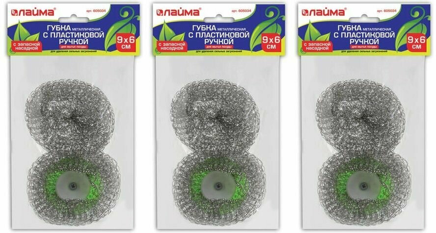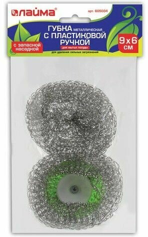 Губка (мочалка) для посуды металлическая ЛАЙМА пластиковая ручка с ЗАПАСНОЙ НАСАДКОЙ 20г 605034 8шт/уп.