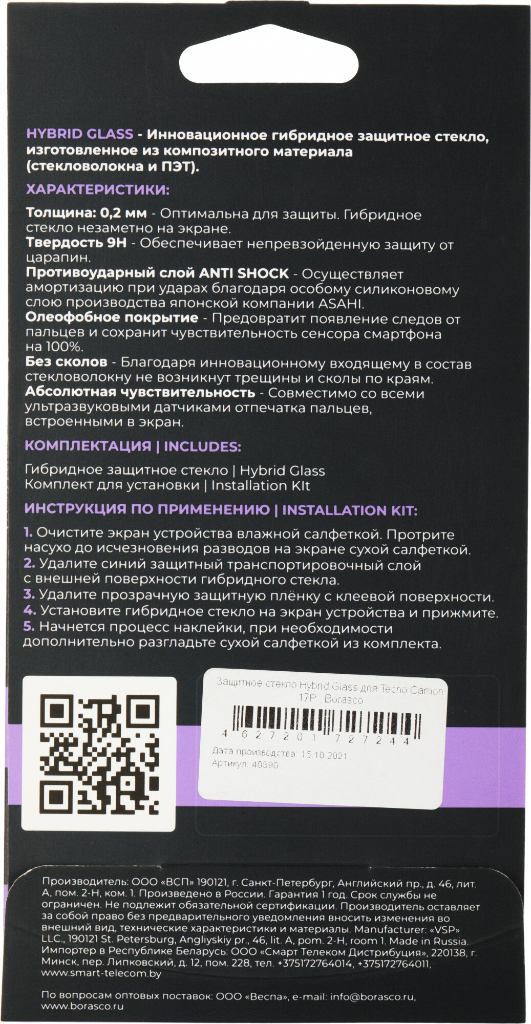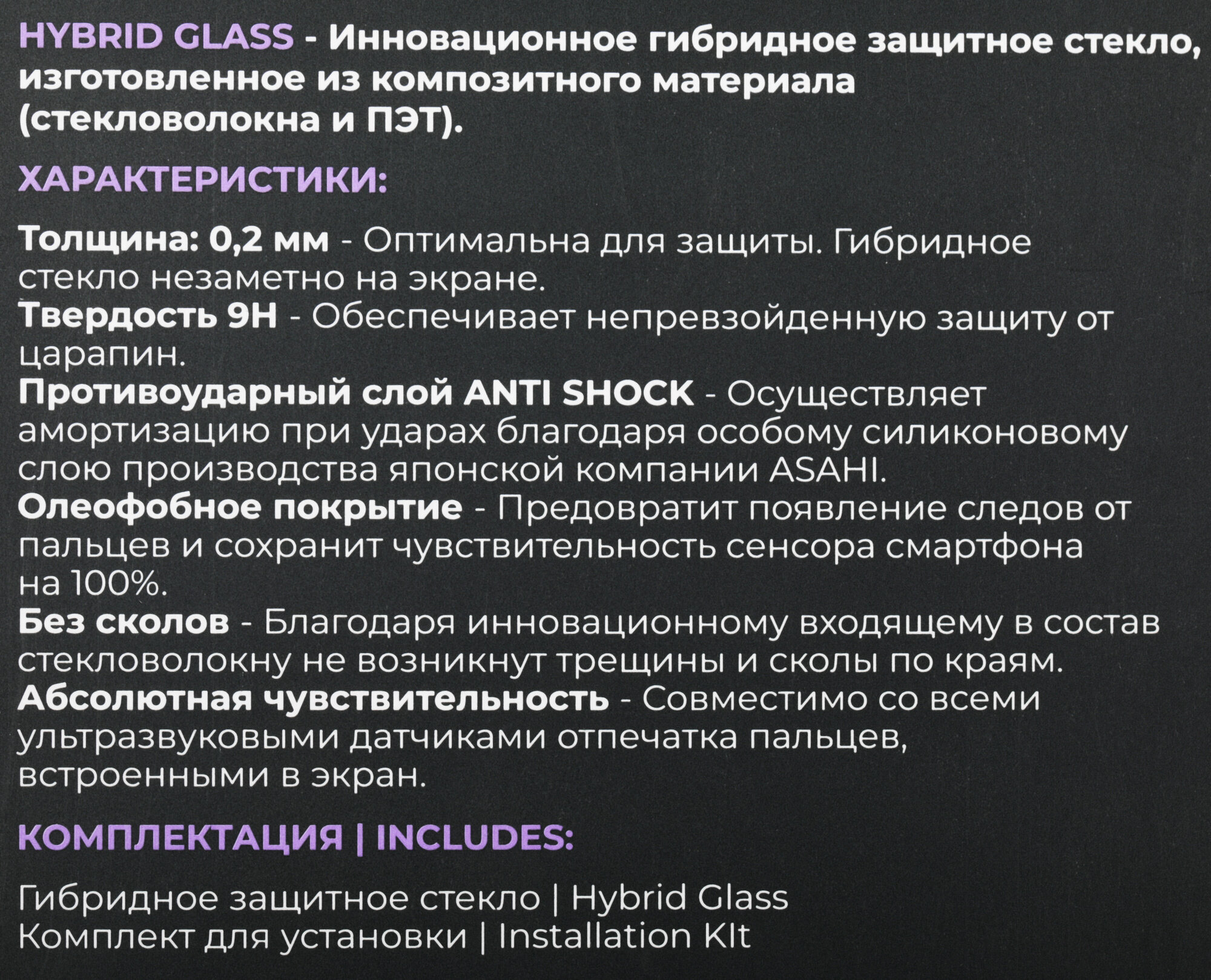 Инновационное гибридное защитное стекло, изготовленное из композитного материала (стекловолокно и ПЭТ). Надежно защищает экран от повреждений благодаря противоударному слою ANTI SHOCK – который осуществляет амортизацию при ударах благодаря особому силиконовому слою производства японской компании ASAHI. Олеофобное покрытие предотвратит появление следов от пальцев и сохранит чувствительность сенсора смартфона на 100%. Имеет высокую степень устойчивости к царапинам 9Н, обеспечивает хорошую чувствительность к касанию и не влияет на сенсорный отклик по всей поверхности дисплея и совместим со всеми ультразвуковыми датчиками отпечатка пальцев, встроенными в экран. Благодаря инновационному входящему в состав стекловолокну не возникнут трещины и сколы по краям. Стекло имеет высокую степень прозрачности.