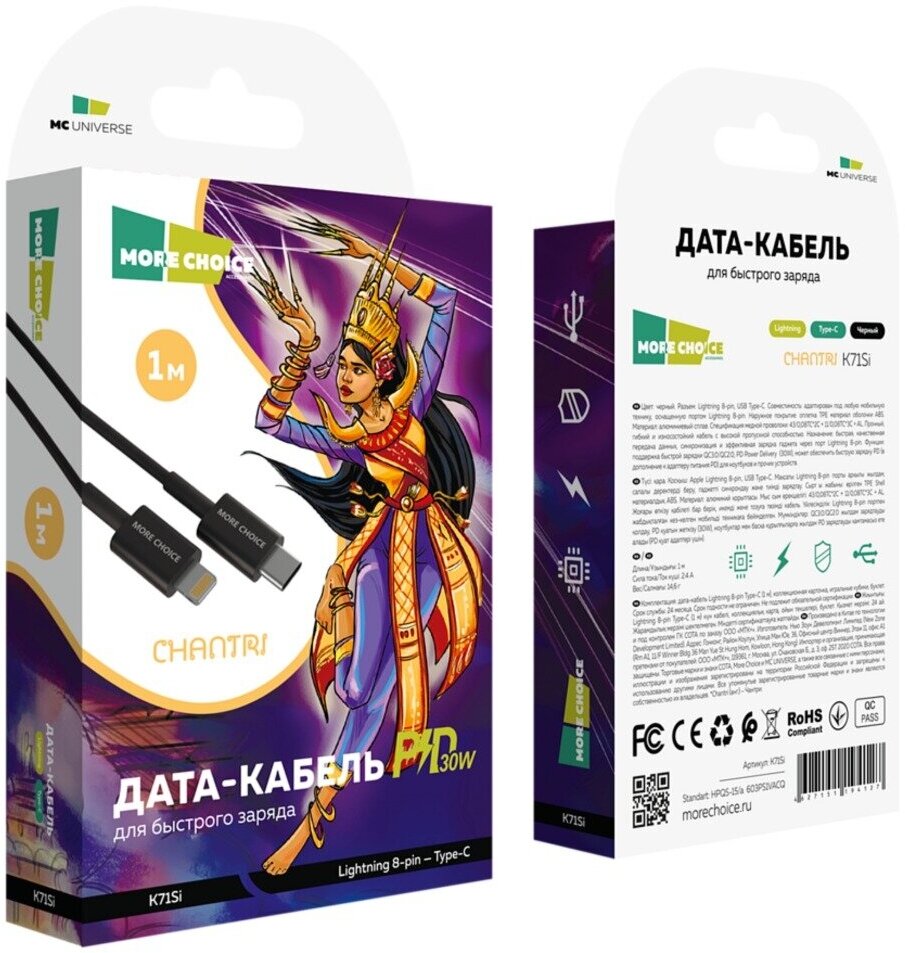 Кабель для зарядки More choice K71Si предназначен для эксплуатации со смартфонами, планшетами, мультимедийными плеерами и другой цифровой техникой apple (iPhone). При помощи этого провода для зарядки осуществляется подключение любых портативных устройств к компьютеру для синхронизации или же к зарядному устройству. Применять кабель питания можно с любой портативной техникой, снабженной интерфейсом подключения Lightning 8-pin. С помощью адаптера питания устройство можно подключать к компьютерной технике и зарядным устройствам, оборудованным портом-выходом Lightning 8-pin и вход Type-C, для обмена данными на высокой скорости и подзарядки батареи. Зарядный кабель подойдет для смартфона, телефона, планшета, наушников, смарт-часов т других устройств и гаджетов.