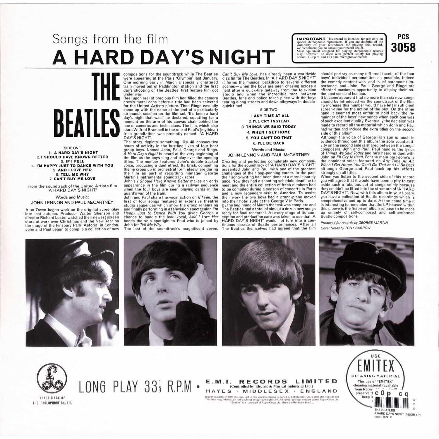 Современный 180-граммовый ремастер третьего альбома The Beatles. Оформление альбома полностью соответствует оригиналу 1964 года и указывает на связь с одноимённым фильмом. Половина композиций из этого альбома вошли в фильм, в котором участники ансамбля играли главные роли. Почти полгода ушло на запись A Hard Days Night, зато он полностью состоял из авторских песен Леннона и Маккартни. На вершине британского хит-парада альбом держался дольше чем провели в студии музыканты создавая этот шедевр! Даже в СССР была выпущена эта пластинка, правда ждать такого знаменательного события пришлось ждать 22 года и появился он без композиции «When I Get Home».