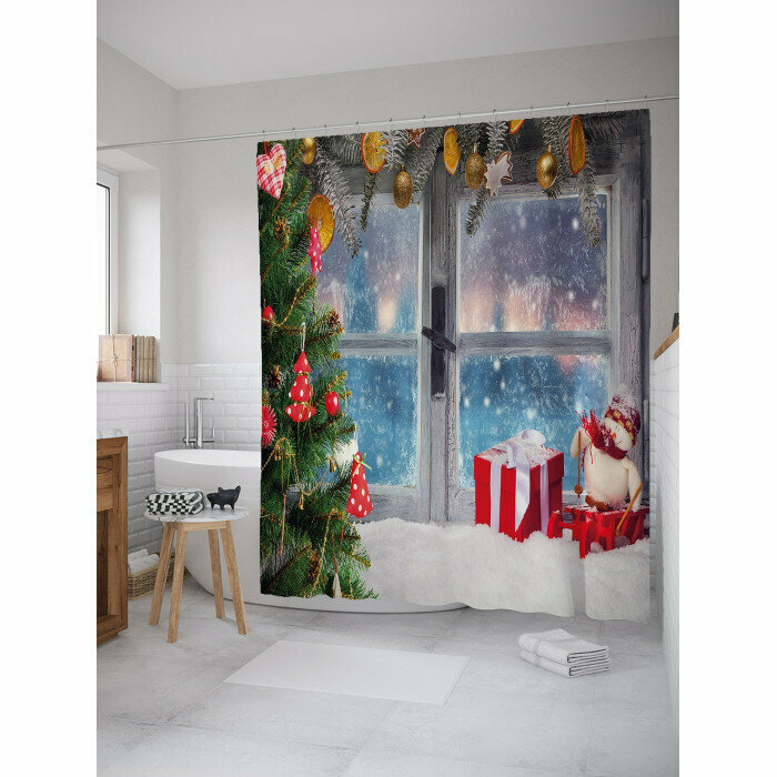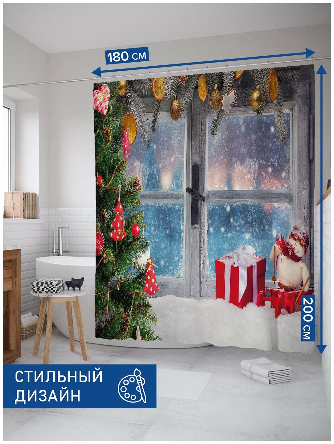 Шторка-занавеска для ванной JOYARTY Штора занавеска для ванной Новогоднее окно из сатена 180х200 см с крючками
