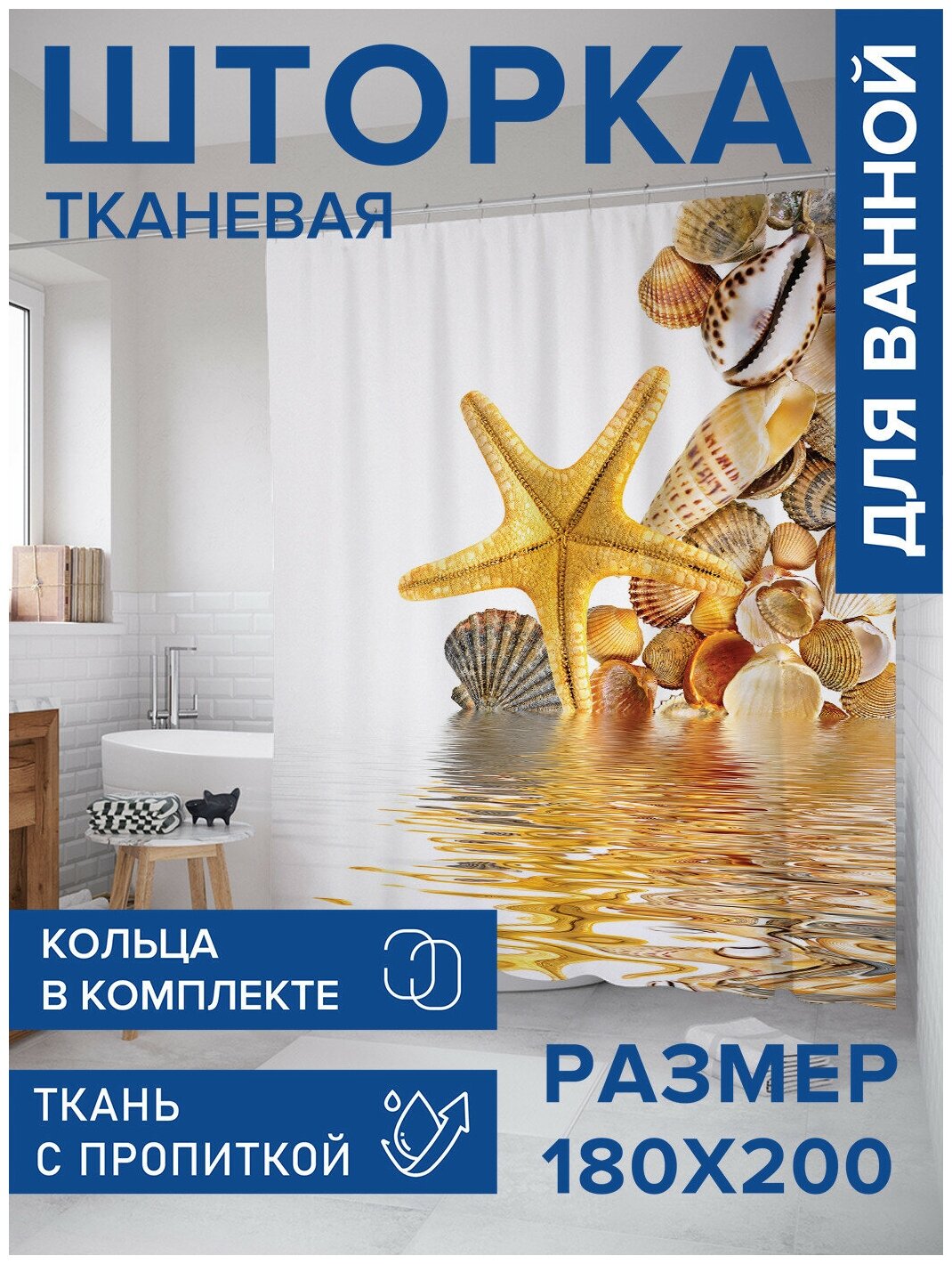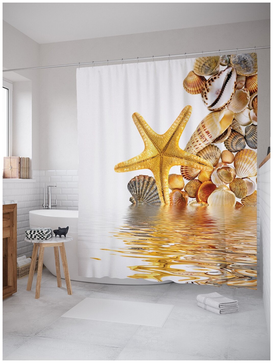 Шторка-занавеска для ванной JOYARTY Штора занавеска для ванной Ракушки и морская звезда из сатена 180х200 см с крючками