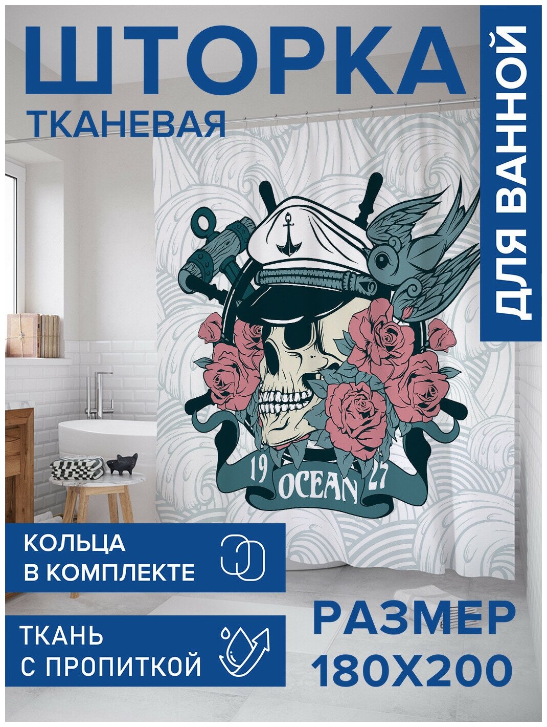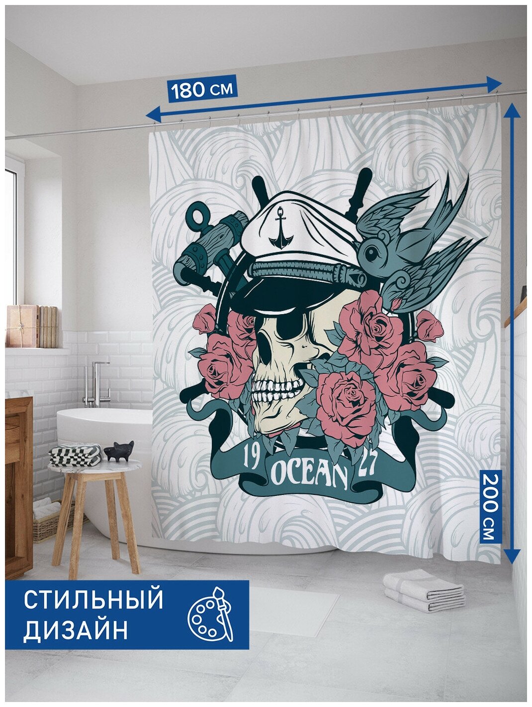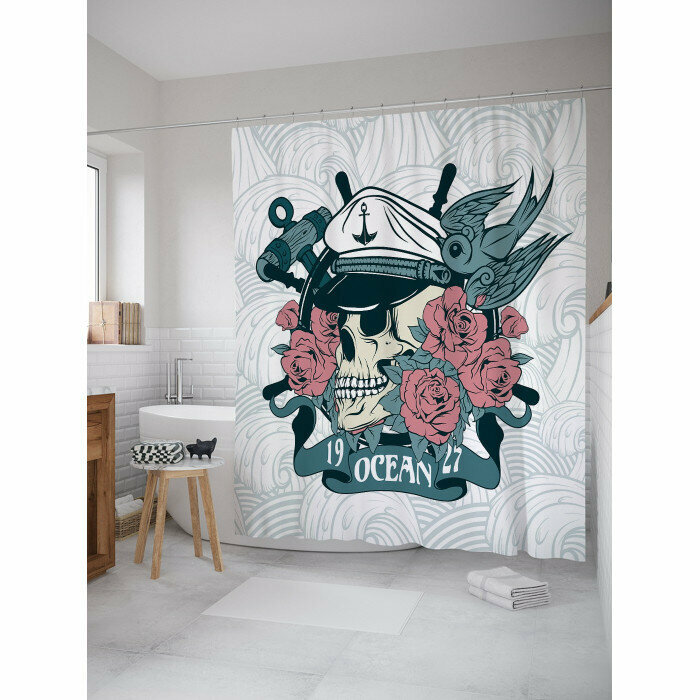 Сервис сравнения цен СкидкаГИД предлагает сравнить цены на товар «Шторка-занавеска для ванной JOYARTY Штора занавеска для ванной Капитанский череп в розах из сатена 180х200 см с крючками»