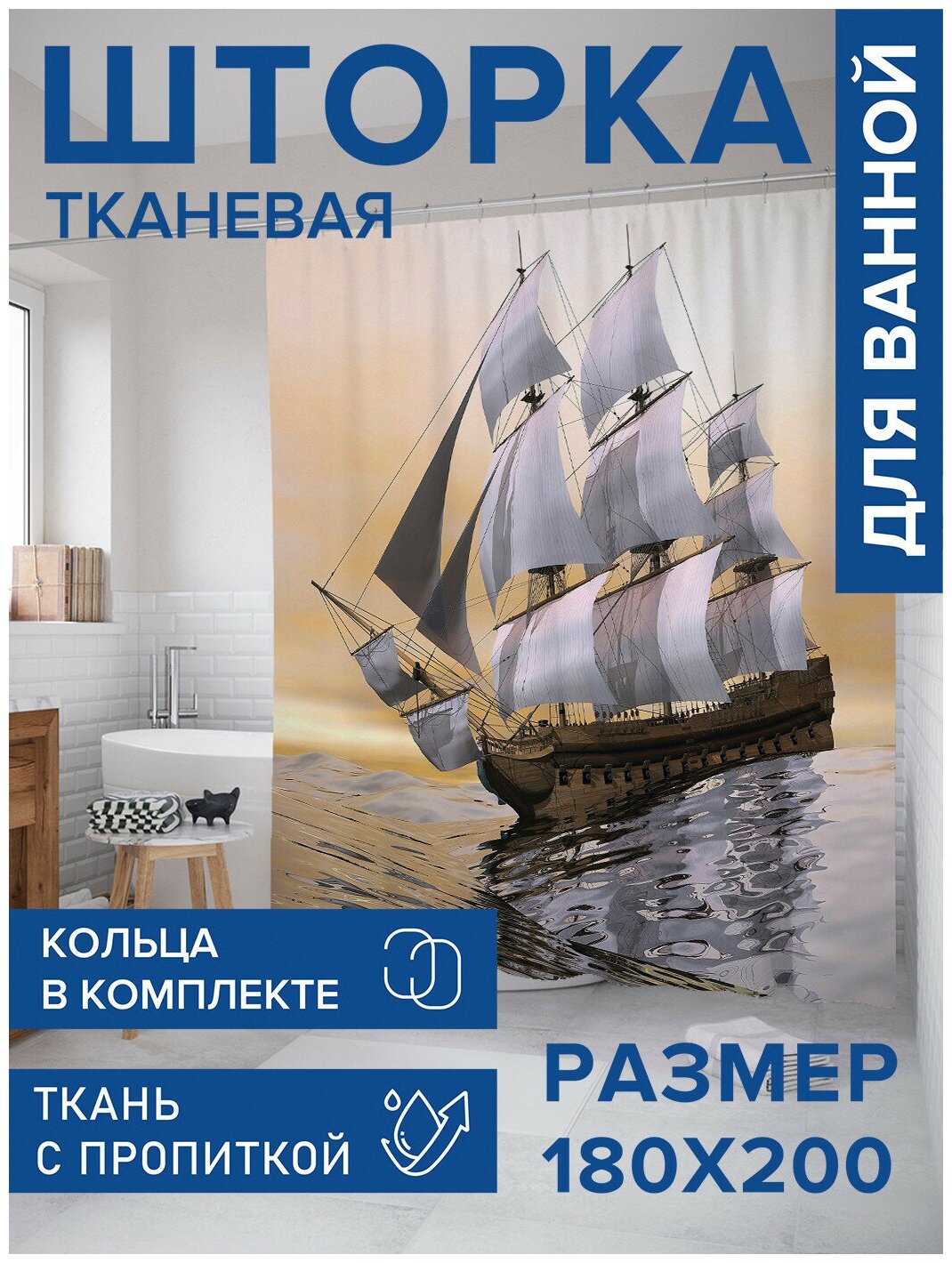 Шторка-занавеска для ванной JOYARTY Штора занавеска для ванной Борьба с волнами из сатена 180х200 см с крючками