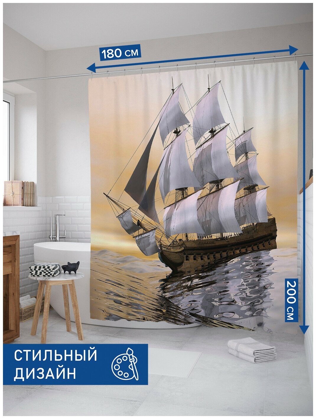 Модель: Штора занавеска для ванной Борьба с волнами из сатена 180х200 см с крючками