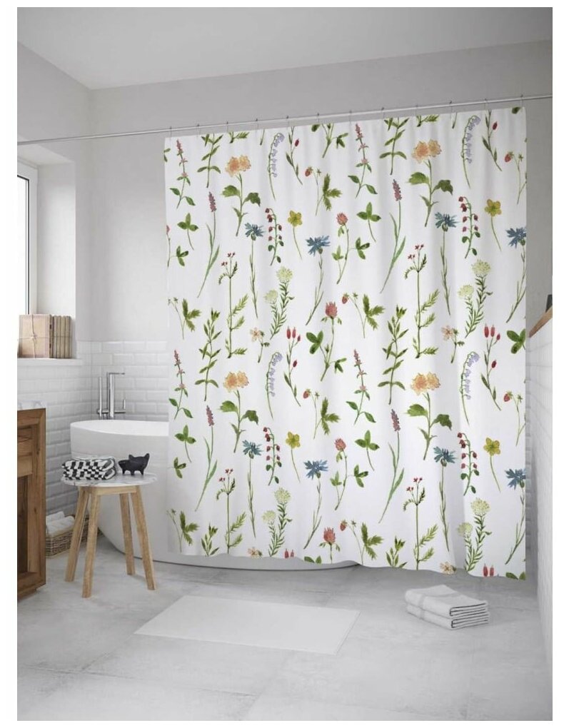 Шторка, размером 180х200 см идет в комплекте с 12 крючками, отверстия для которых качественно и надежно обработаны оверлоком и не имеют люверсов. Рисунок нанесен на внешнюю сторону изделия с помощью сублимационной печати, такие принты не боятся влаги и не смываются под горячей водой. Обратная сторона шторки – белая, но рисунок просвечивает.