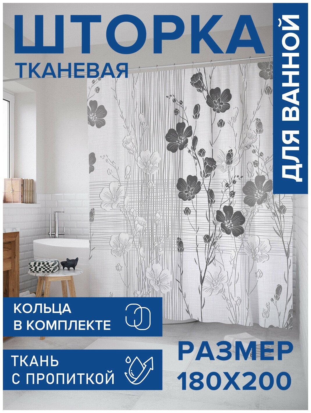 Комплектация: шторка для ванной 180х200 см, крючки – 12 шт. Материал: сатен; состав: полиэстер 100%. Плотность: 80 гр/кв.м.