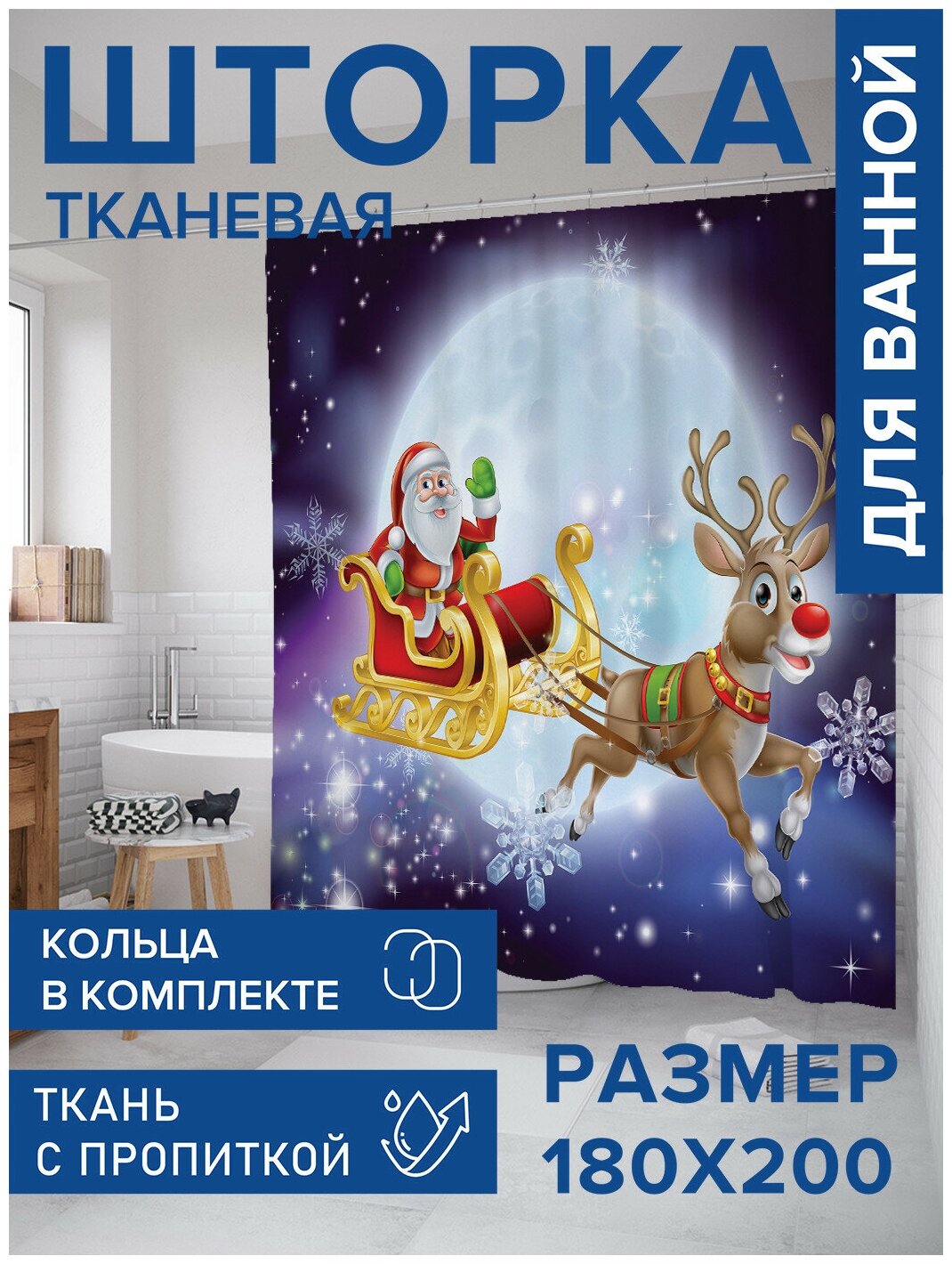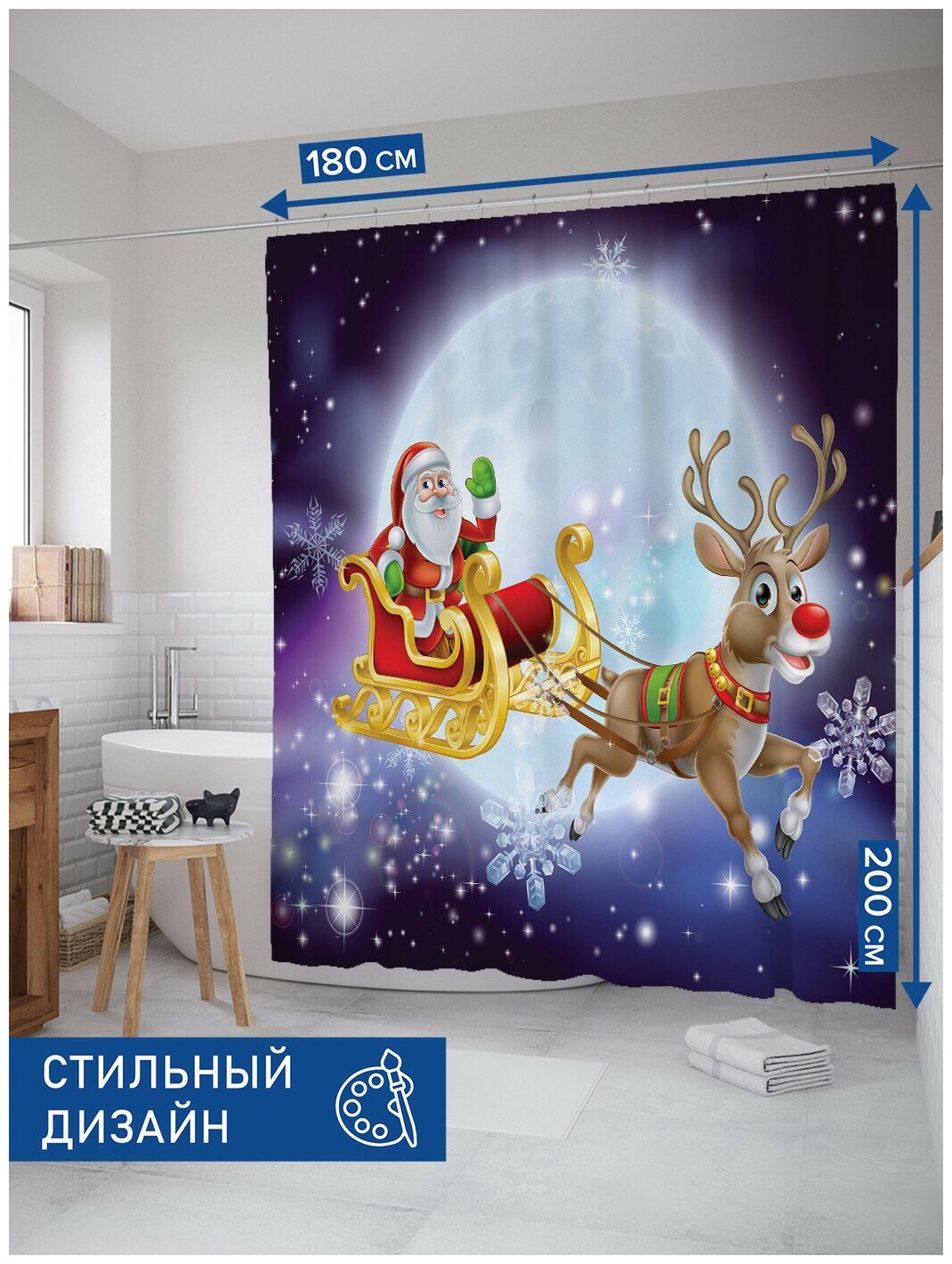 Шторка-занавеска для ванной JOYARTY Штора занавеска для ванной Санта и веселый олень из сатена 180х200 см с крючками