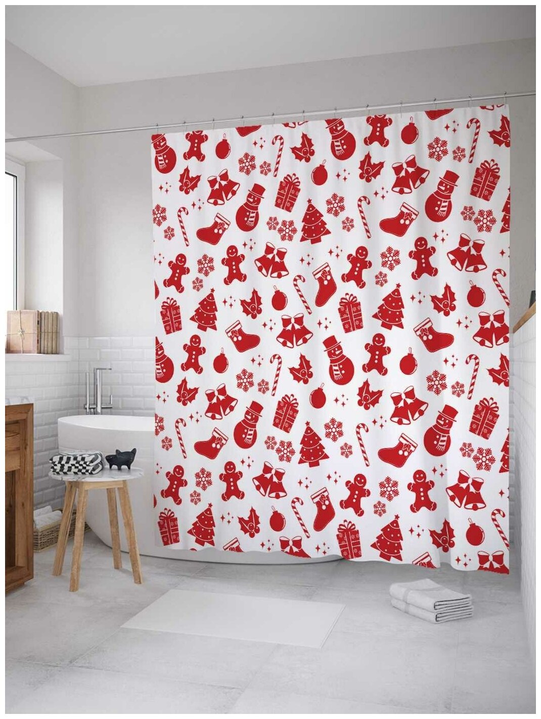 Шторка-занавеска для ванной JOYARTY Штора занавеска для ванной Новогодние атрибуты из сатена 180х200 см с крючками