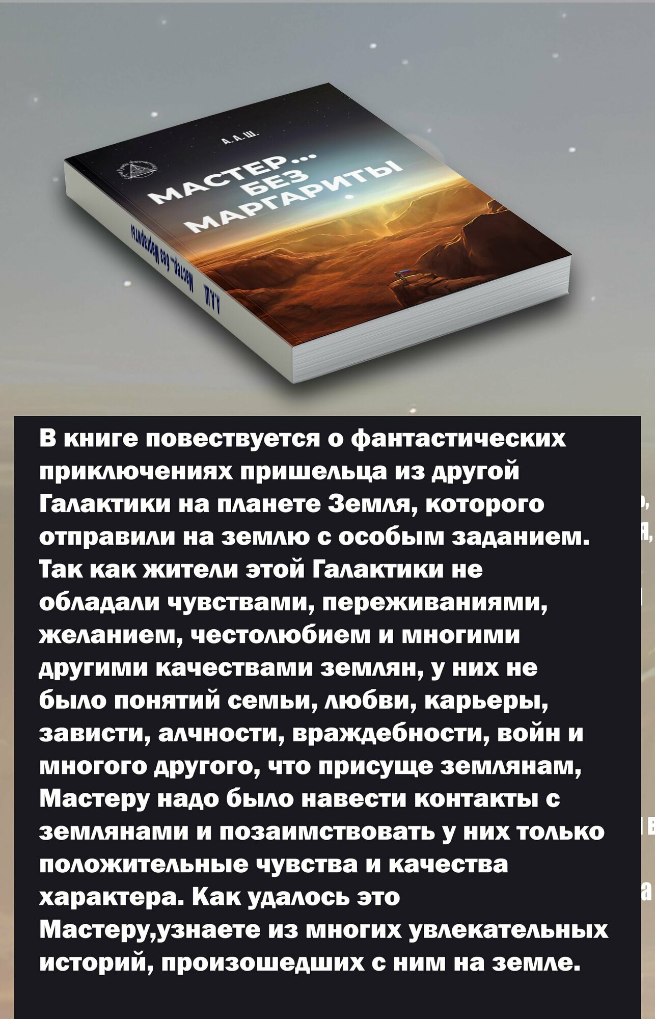 В книге повествуется о фантастических приключениях пришельца из другой Галактики на планете Земля, которого отправили на землю с особым заданием. Так как жители этой Галактики не обладали чувствами, переживаниями, желанием, честолюбием и многими другими качествами землян, у них не было понятий семьи, любви, карьеры, зависти, алчности, враждебности, войн и многого другого, что присуще землянам, Мастеру надо было навести контакты с землянами и позаимствовать у них только положительные чувства и качества характера. Как удалось это Мастеру, узнаете из многих увлекательных историй, произошедших с ним на земле.