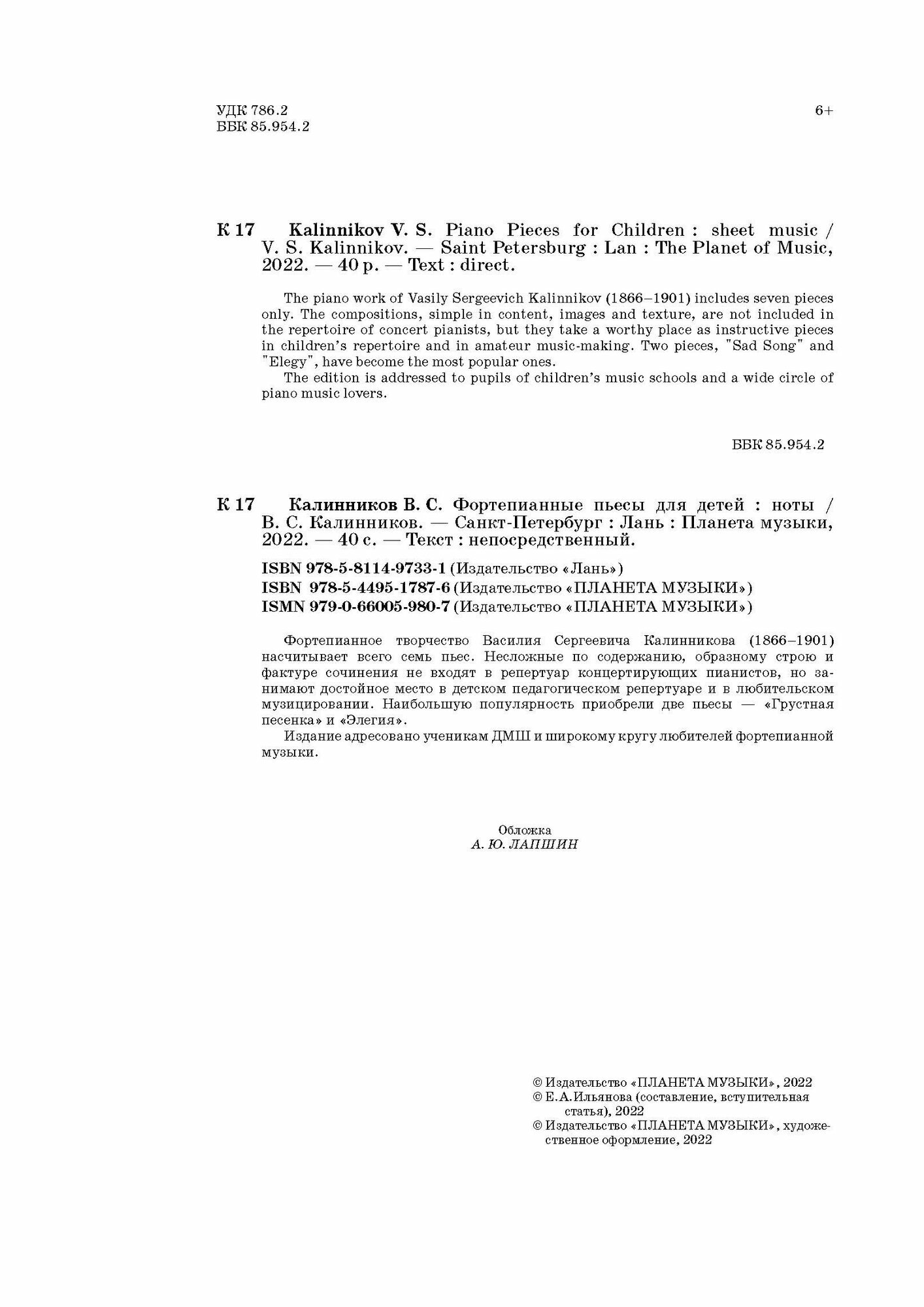 Фортепианное творчество Василия Сергеевича Калинникова (1866-1901) насчитывает всего семь пьес. Несложные по содержанию, образному строю и фактуре сочинения не входят в репертуар концертирующих пианистов, но занимают достойное место в детском педагогическом репертуаре и в любительском музицировании. Наибольшую популярность приобрели две пьесы - "Грустная песенка" и "Элегия". Издание адресовано ученикам ДМШ и широкому кругу любителей фортепианной музыки.