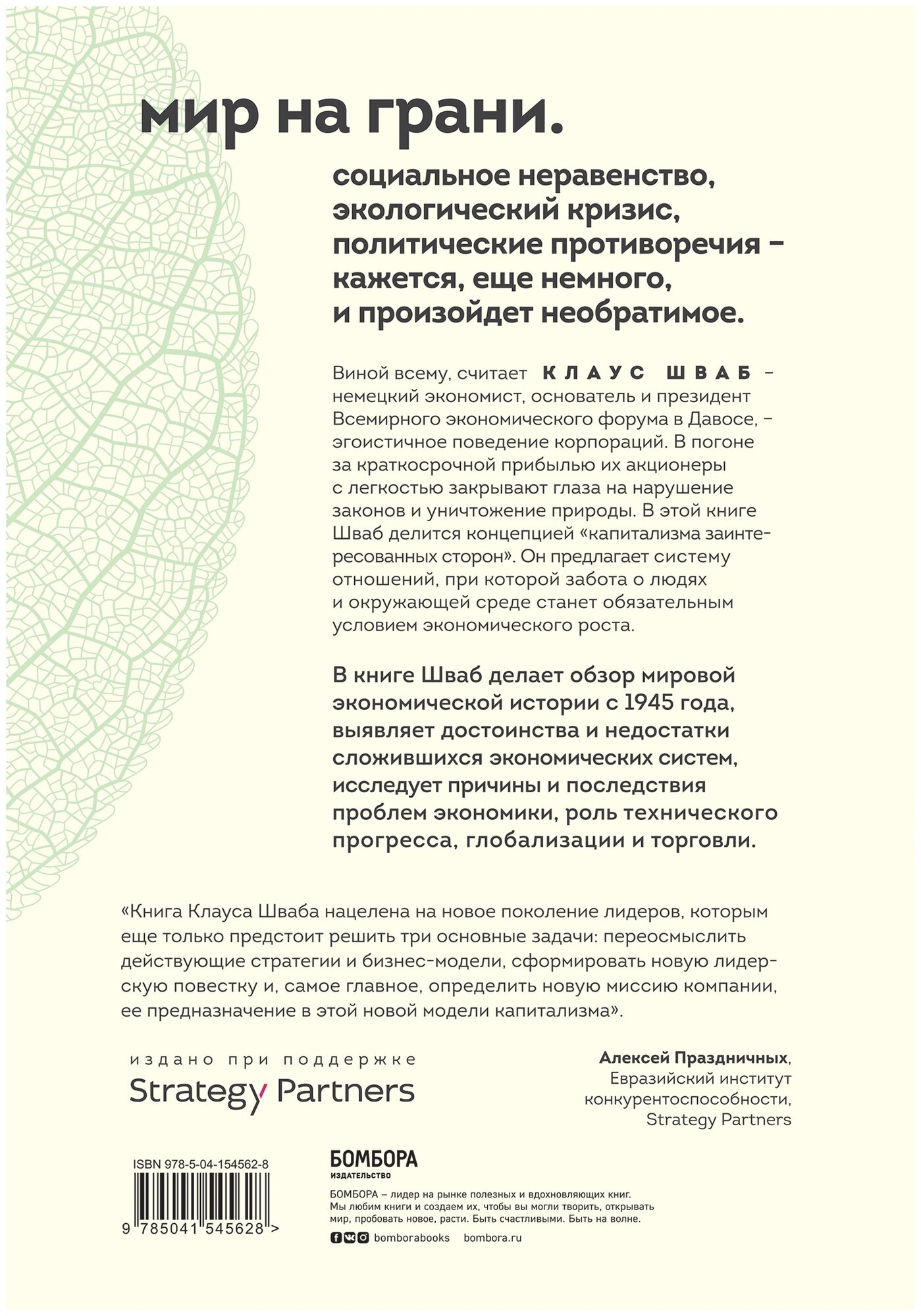 Переосмысление нашей глобальной экономики, чтобы она стала более устойчивой и процветающей. Шваб ищет реальные причины недостатков нашей системы и находит решения на основе лучших практик со всего мира в таких разных странах, как Китай и Дания, Эфиопия, Германия, Индонезия, Новая Зеландия и Сингапур.