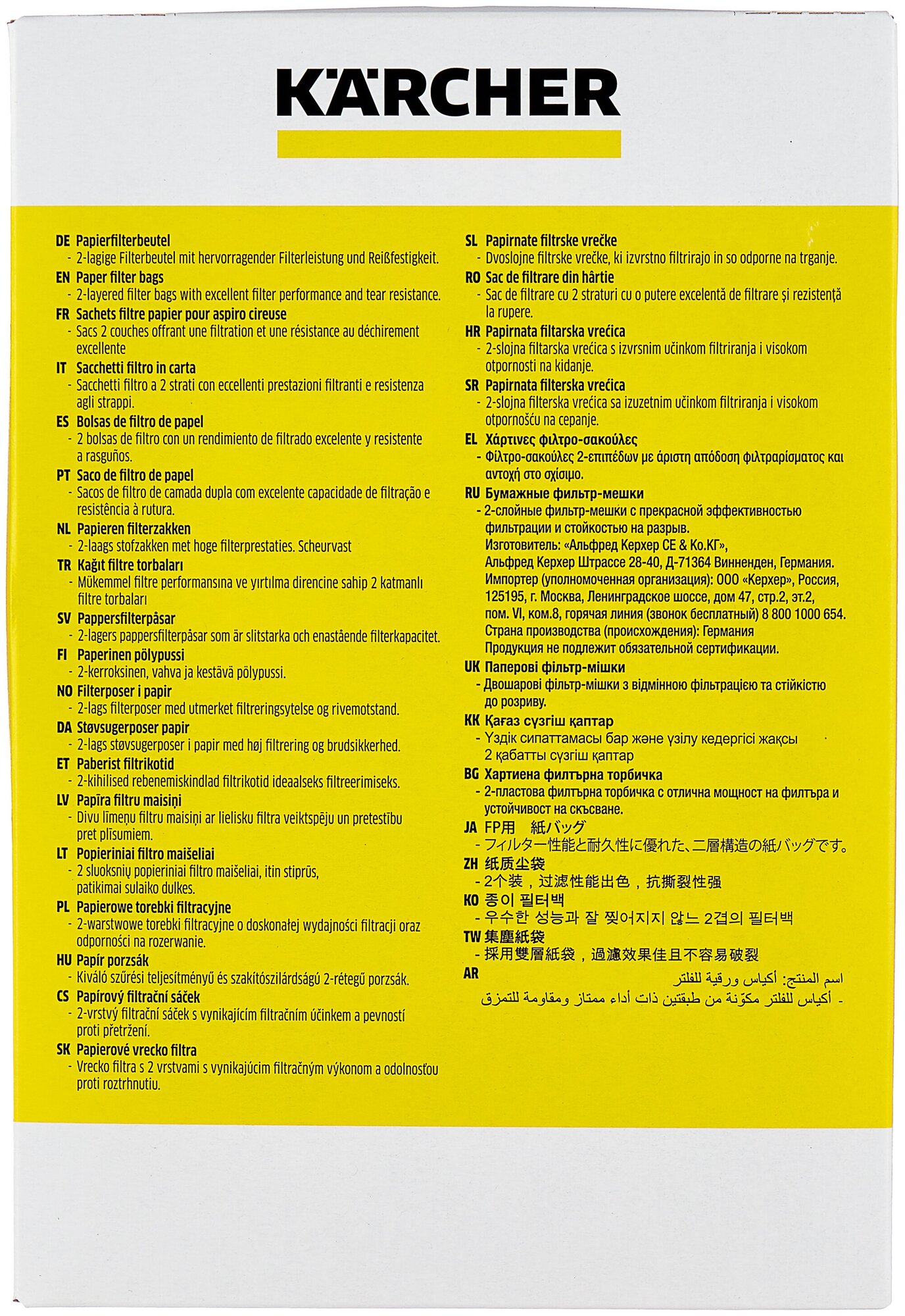 | Прочие особенности и свойства | Бумажные фильтр-мешки (комплект 5 шт.) изготовлены из прочной бумаги с высокой степенью фильтрации. Используются в модели пылесоса WD 2. |