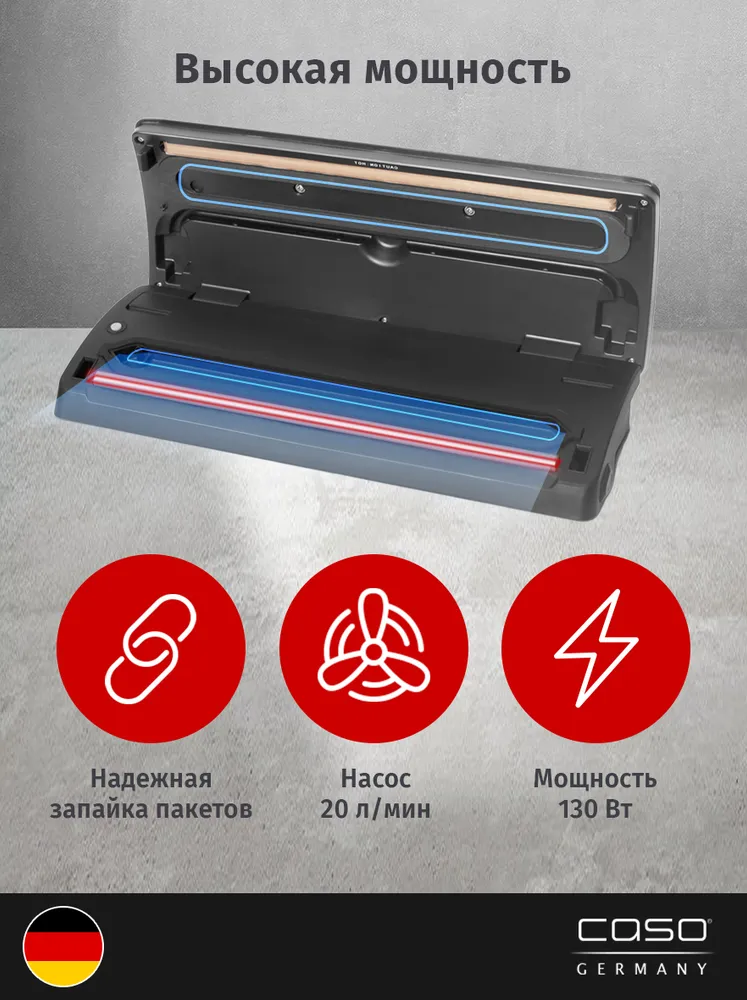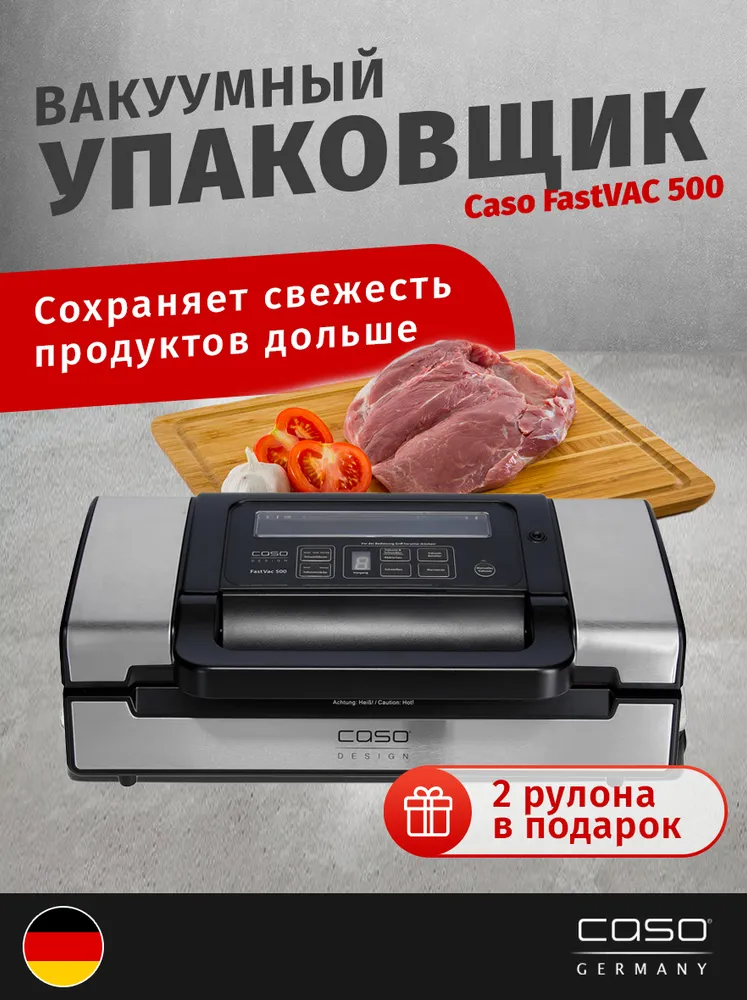 Caso – профессиональный вакуумный упаковщик. Позволяет обеспечить сохранение свежести и вкуса продуктов на протяжении долгого времени. Помимо этого, может использоваться в непродовольственной сфере, например, для упаковки одежды.