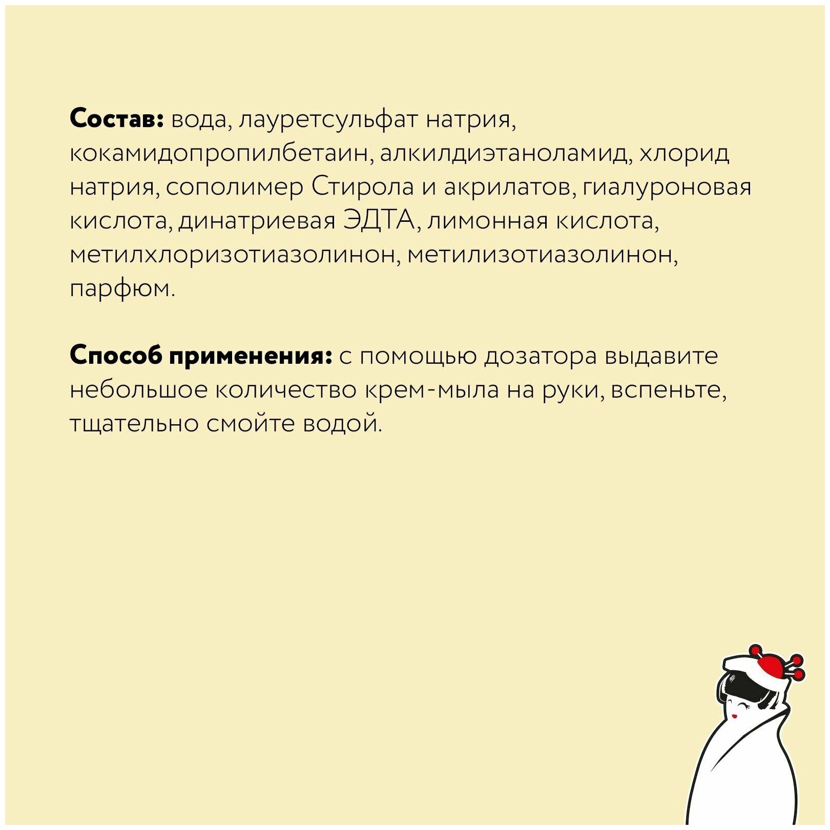 | Состав | Вода, лауретсульфат натрия, кокамидопропилбетаин, алкилдиэтаноламид, хлорид натрия, сополимер Стирола и акрилатов, гиалуроновая кислота, динатриевая ЭДТА, лимонная кислота, метилхлоризотиазолинон, метилизотиазолинон, парфюм. |