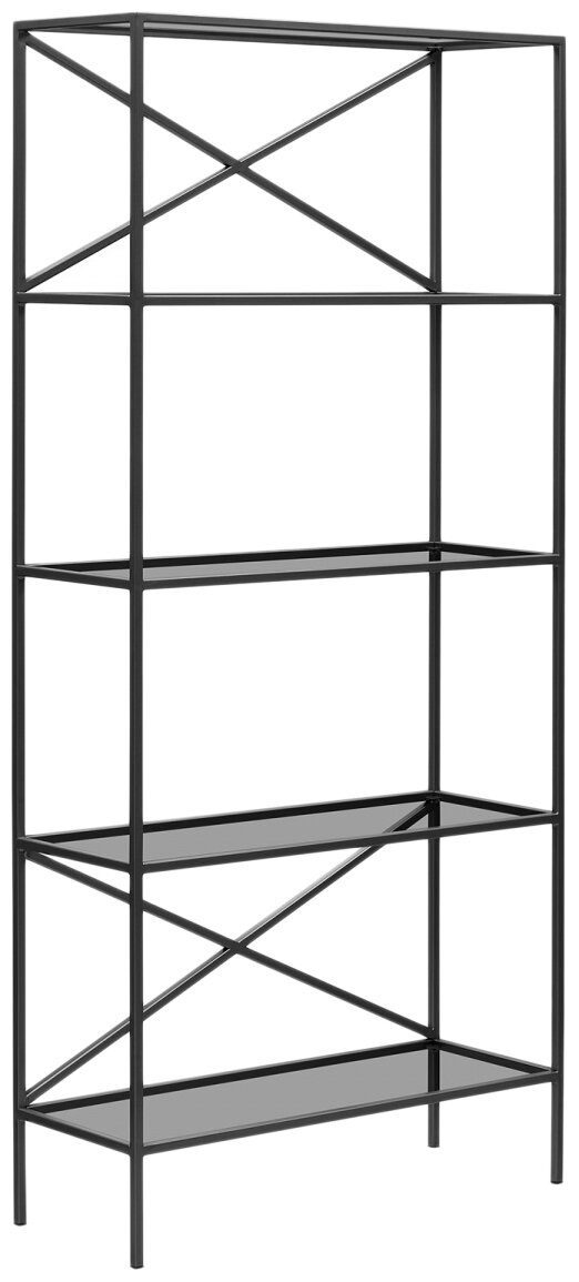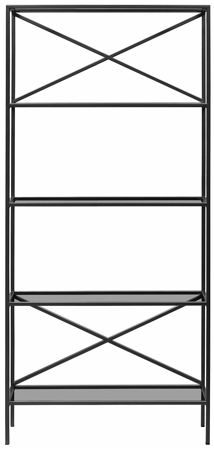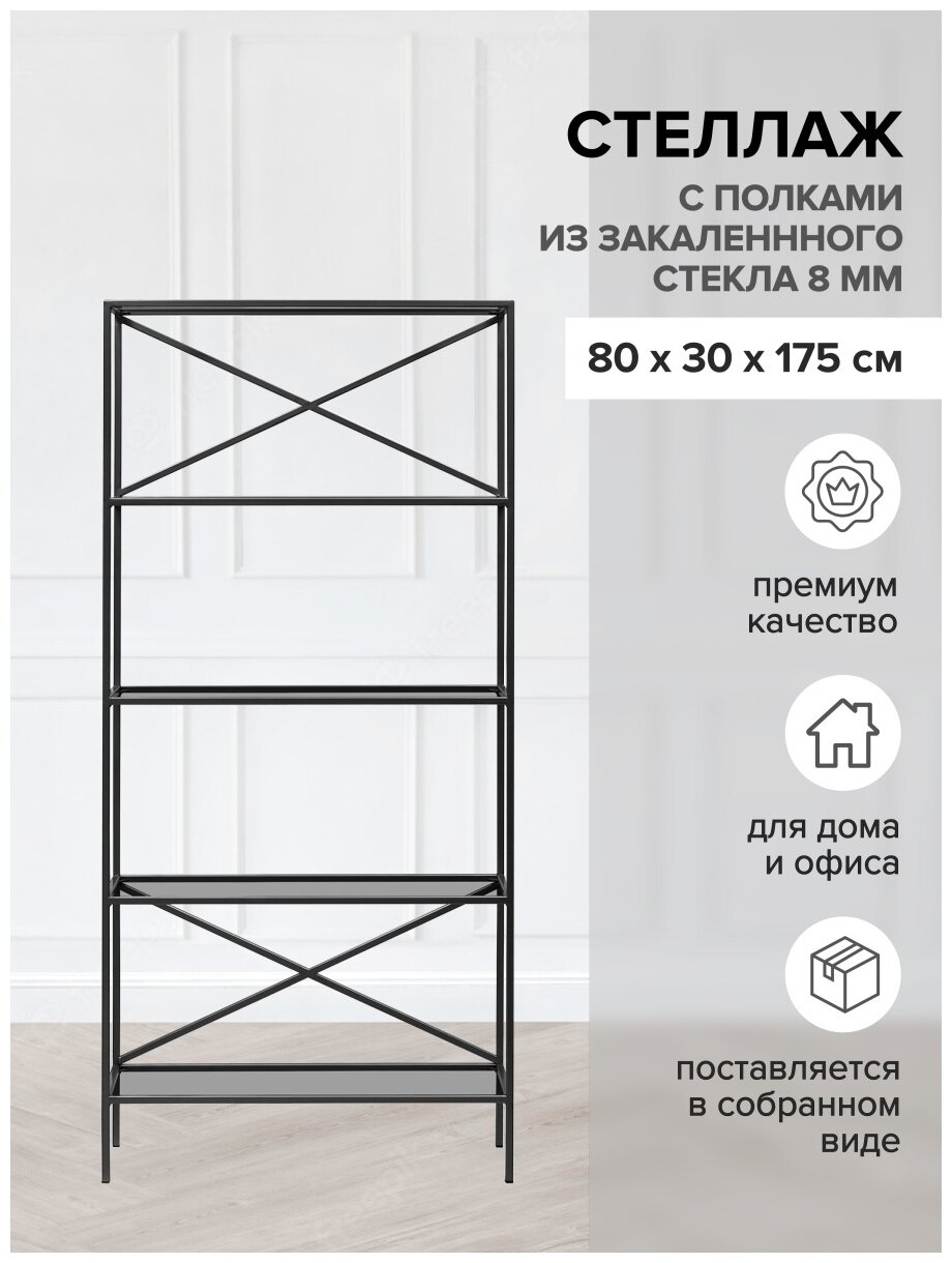 Каркас стеллажа изготовлен из стали с полимерным покрытием. Полки стеллажа выполнены из закаленного тонированного стекла толщиной 8 мм и выдерживают нагрузку до 10 кг.