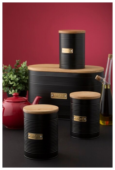 Емкость для хранения чая Otto поможет организовать рабочее пространство на вашей кухне. Эргономичный контейнер из эмалированной стали снабжен бамбуковой крышкой с воздухопроницаемым уплотнителем из силикона, что поможет продлить свежесть продукта и защитит его от воздействия влаги. При создании изделия дизайнеры используют золотистый декор, который безупречно сочетается с матовым покрытием черного цвета. Благодаря этому емкость добавит элегантности классическому и современному интерьеру кухни. Помимо чая в банке можно хранить любые сыпучие продукты."