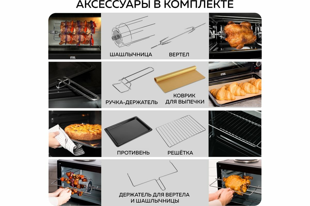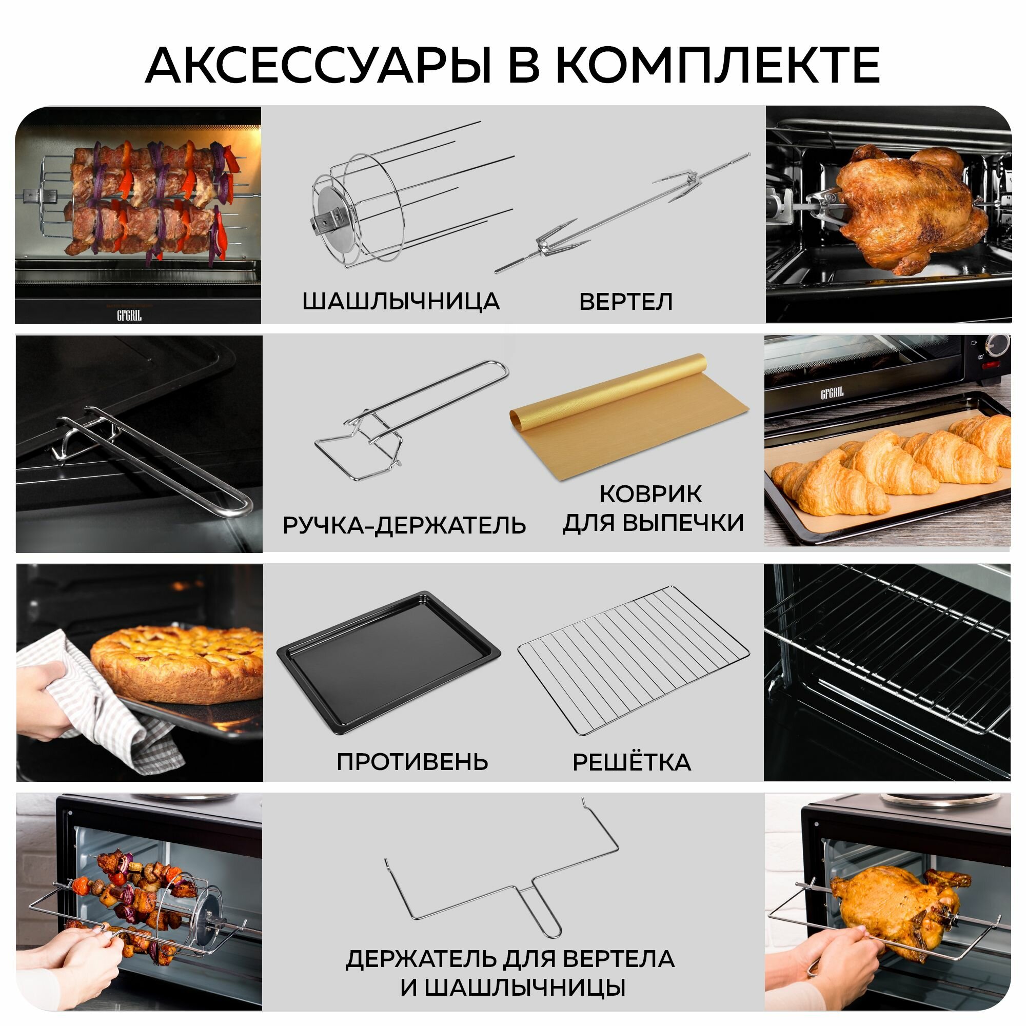 Другие аксессуары в комплекте: противень(поддон) размером 29,5 см *38,7 см, решетка, держатель для вертела, ручка-держатель.