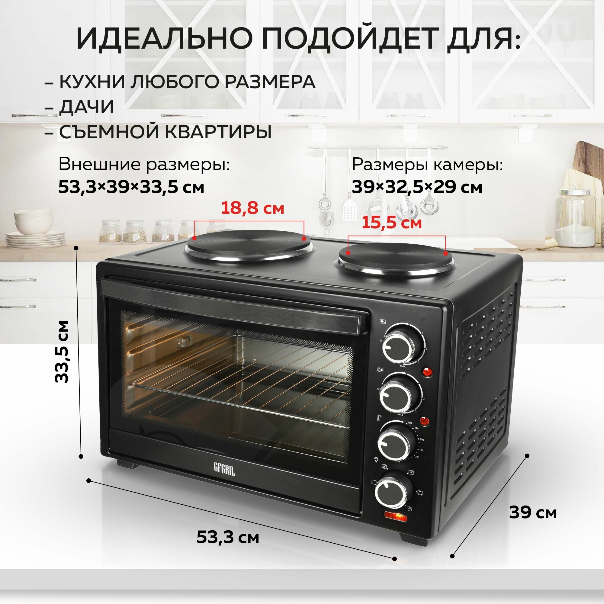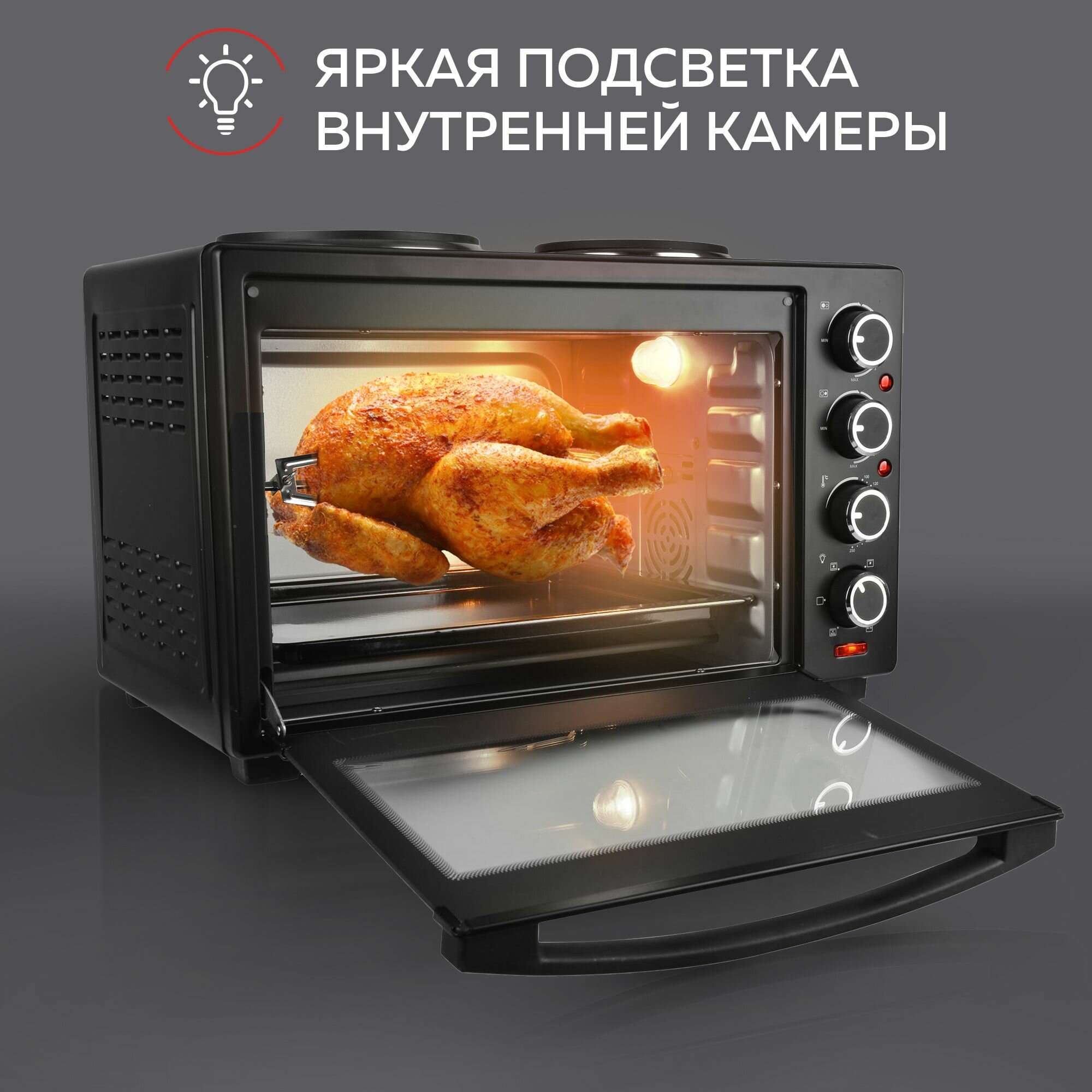 Внутренний объём 38 литров, внутренние размеры камеры 39,4 см *28,4 см *31,4 см, внешние размеры мини-печи 53,3 см *39 см *33,5 см. Толстое жаропрочное стекло дверцы и яркая внутренняя подсветка позволяют наблюдать за процессом приготовления.