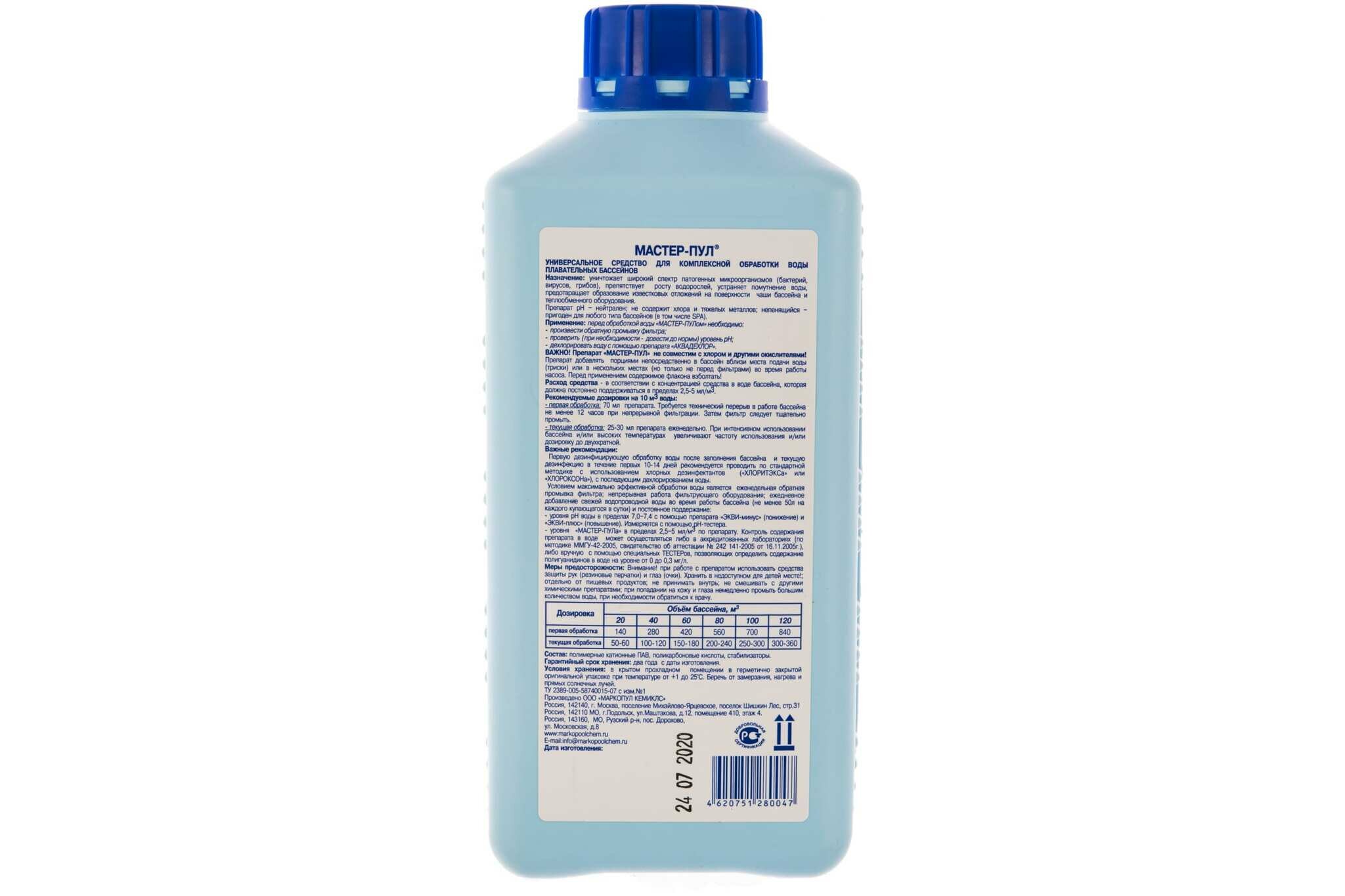 | Способ применения | Средство необходимо хорошо взболтать. Заливать нужно в место поступления воды в бассейн. Для расчета дозировки используется колпачок, который вмещает 50 миллилитров препарата. Дозировка Мастер-Пул |