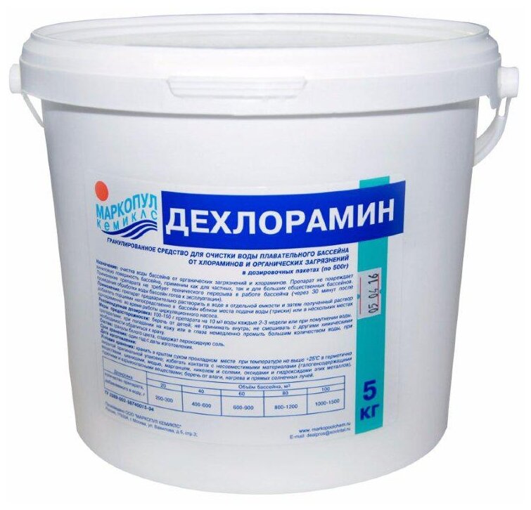 Его применение позволяет снизить расходы на техническом обслуживании (нет необходимости в последующем дехлорировании воды) и существенно уменьшить время технического перерыва (бассейн может использоваться уже через 30 минут после обработки «ДЕХЛОРАМИНОМ»!).