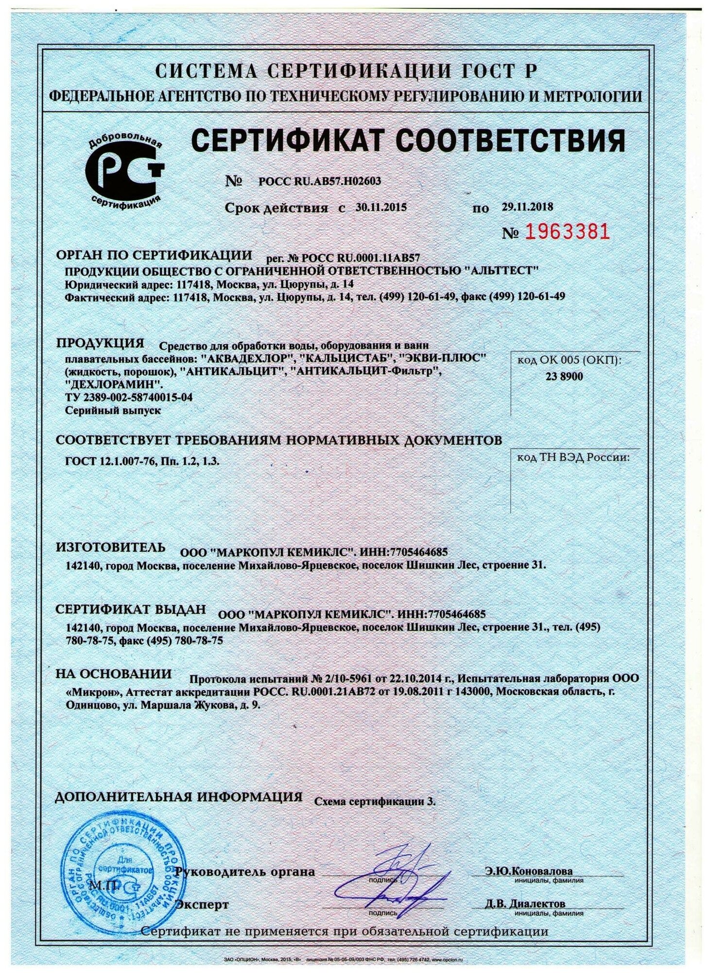 | Способ применения | Препарат предварительно растворяют в воде в отдельной емкости и затем полученный раствор добавляют порциями непосредственно в воду бассейна вблизи места подачи воды (триски) или в нескольких местах одновременно во время работы циркуляционного насоса |
