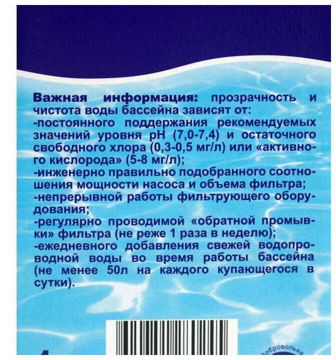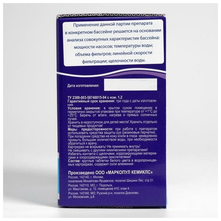 | Способ применения | После тщательной обратной промывки фильтра необходимое количество картриджей поместить в префильтр или скиммер, затем включить фильтр в режим фильтрации. После полного растворения таблеток картриджи утилизируются |