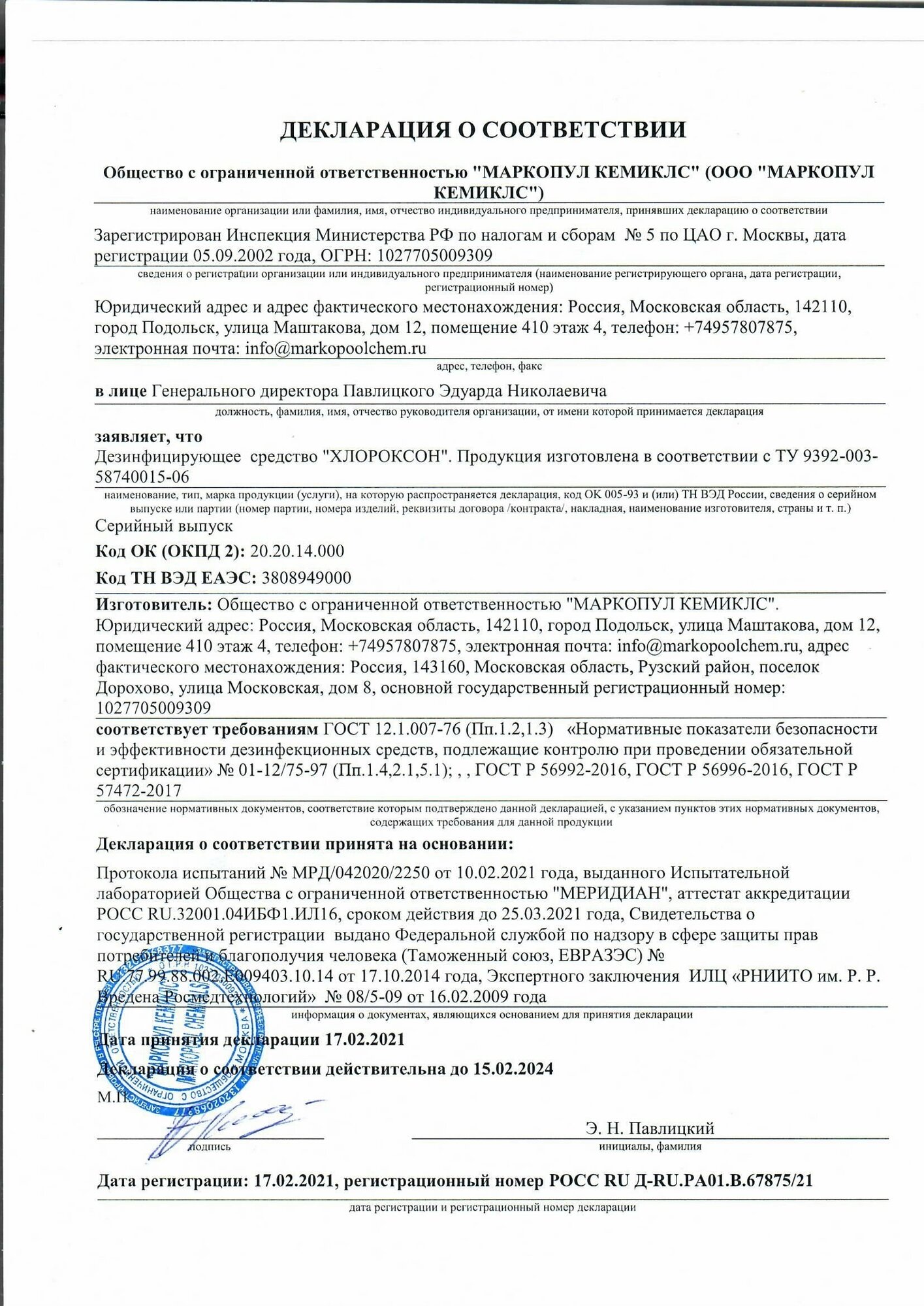 Тип товара: Хлороксон