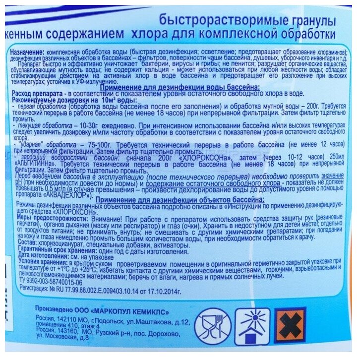 - Состав: хлорпроизводное изоциануровой кислоты, активатор, осветлитель (содержание активных веществ (в пересчете на активный хлор) – не менее 40%). Характеристики и комплектация могут быть изменены производителем без предварительного уведомления.