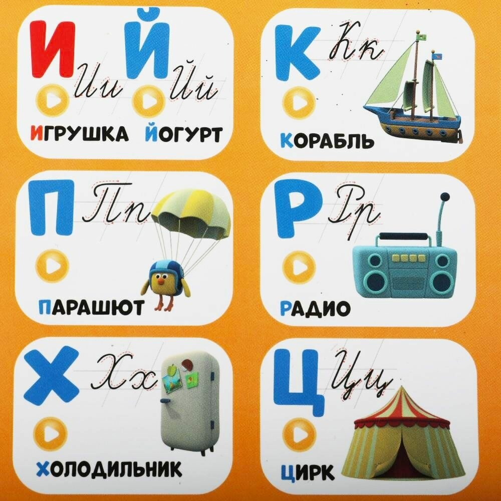 Полезная «база» для обучения ребёнка в виде говорящего плаката. Преподнесённую в визуальном и звуковом форматах информацию ребёнку будет проще усвоить и запомнить. Малыш с удовольствием будет нажимать на разнообразные кнопки и в лёгкой игровой форме знакомиться с русским и английским алфавитом.