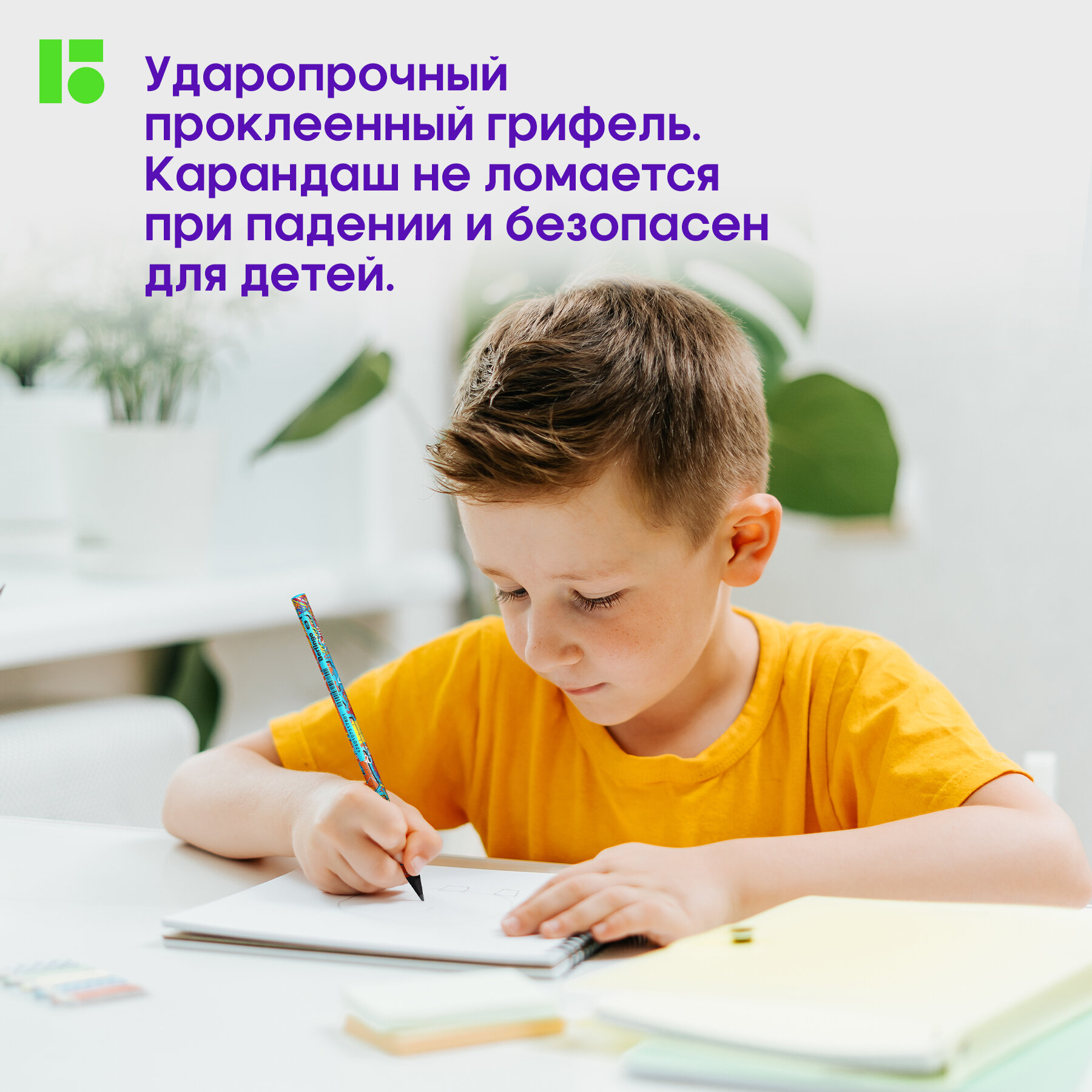 Карандаш не ломается при падении и безопасен для детей. Карандаш закруглен, срез обработан. Он подходит для черчения и рисования.