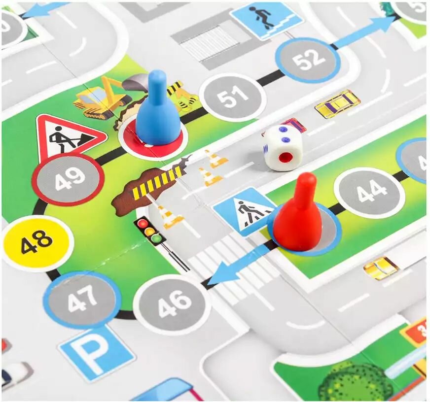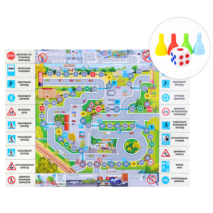 Настольная игра "Правила дорожного движения" - это настоящее увлекательное путешествие по городу, в которое вам захочется отправиться с друзьями. Вы познакомитесь со знаками дорожного движения и узнаете, что они означают, ознакомитесь с правилами поведения на дороге, что очень важно в наше время, а также посоревнуетесь, кто первый придет к финишу, соблюдая правила дорожного движения.