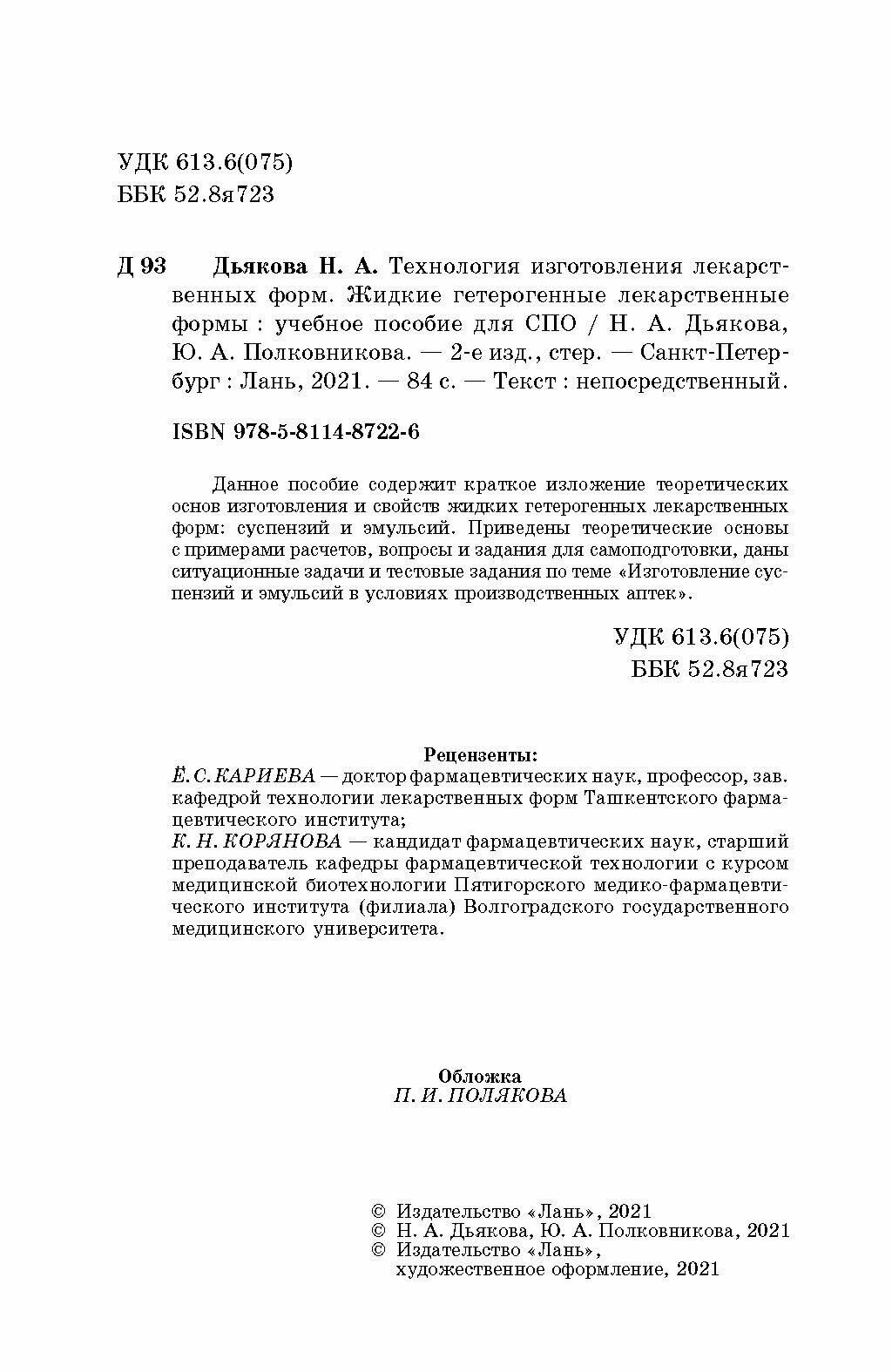 Сервис сравнения цен СкидкаГИД предлагает сравнить цены на товар «Книга: Технология изготовления лекарственных форм. Жидкие гетерогенные лекарственные формы. Учебное пособие (Полковникова Юлия Александровна, Дьякова Нина Алексеевна); Лань, 2021»