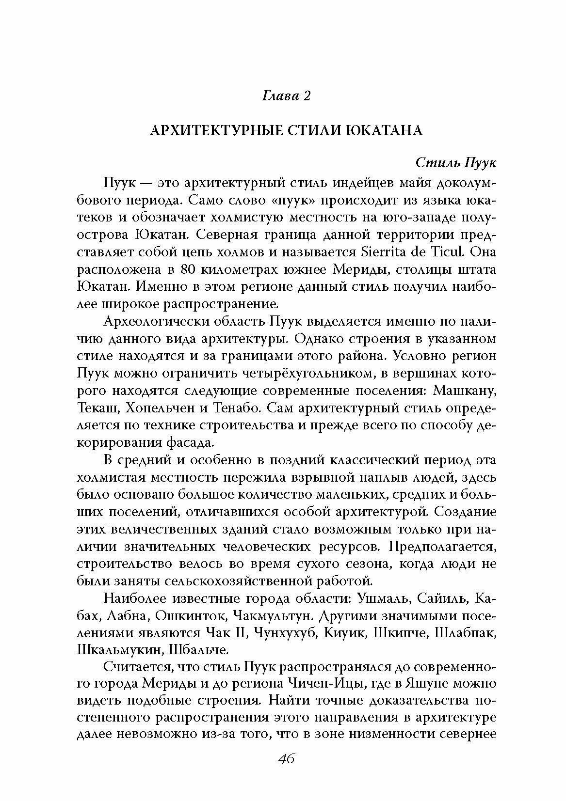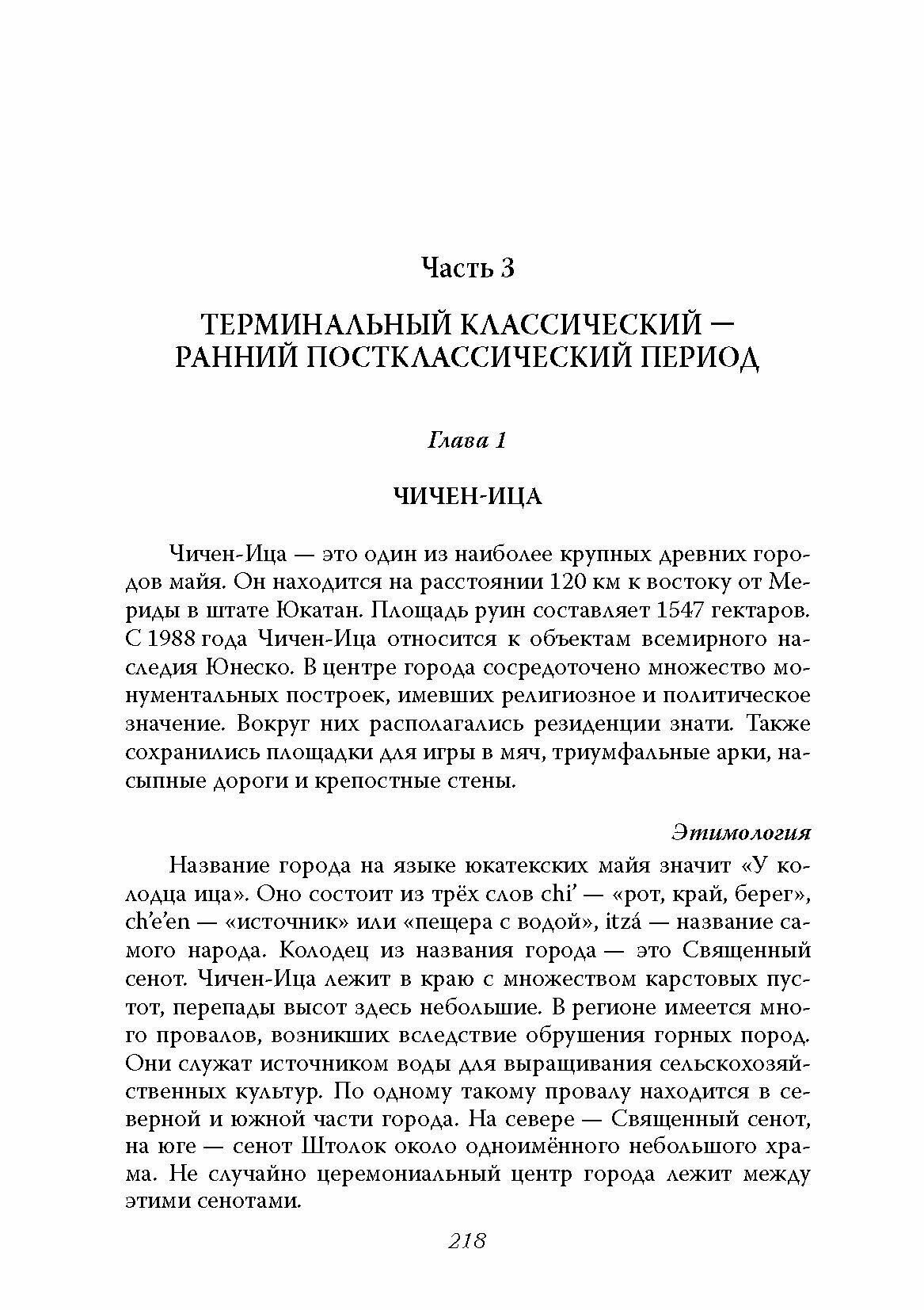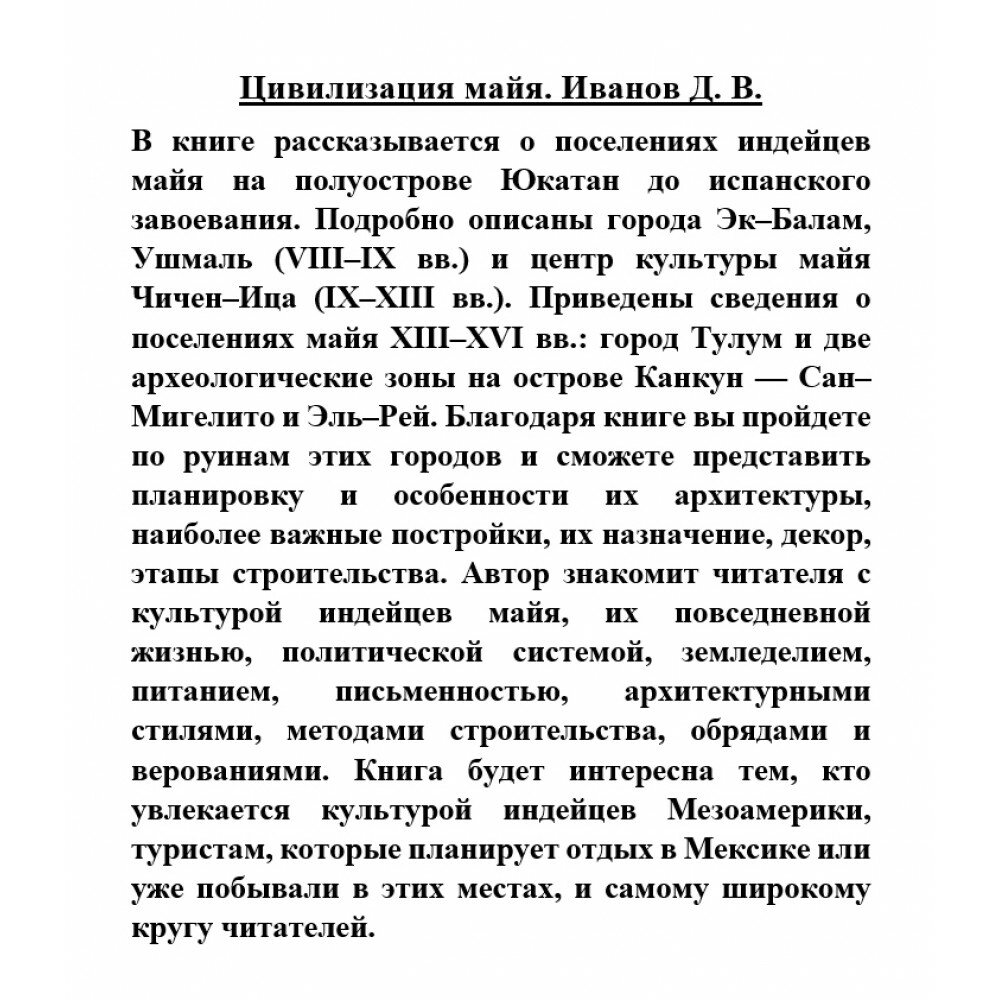В книге рассказывается о поселениях индейцев майя на полуострове Юкатан до испанского завоевания. Подробно описаны города Эк–Балам, Ушмаль (VIII-IX вв.) и центр культуры майя Чичен–Ица (IX-XIII вв.). Приведены сведения о поселениях майя XIII-XVI вв.: город Тулум и две археологические зоны на острове Канкун — Сан–Мигелито и Эль–Рей. Благодаря книге вы пройдете по руинам этих городов и сможете представить планировку и особенности их архитектуры, наиболее важные постройки, их назначение, декор, этапы строительства. Автор знакомит читателя с культурой индейцев майя, их повседневной жизнью, политической системой, земледелием, питанием, письменностью, архитектурными стилями, методами строительства, обрядами и верованиями. Книга будет интересна тем, кто увлекается культурой индейцев Мезоамерики, туристам, которые планирует отдых в Мексике или уже побывали в этих местах, и самому широкому кругу читателей.